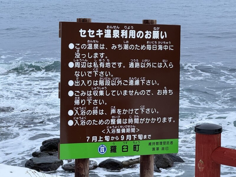 冬になると温泉に入るまでの道が雪で埋まるため、入浴できるのは春から秋にかけてのみ。満潮時は完全に海に沈んでしまうので入れない(強引に入れそうだが危険)。波が高い日はリスクがあるし、そもそも春であろうと夏であろうとクマが出る地域なので、その点も念頭において挑みたい。つまり、いろいろとハードな温泉である。