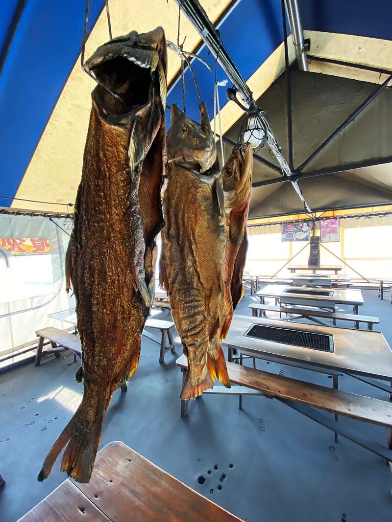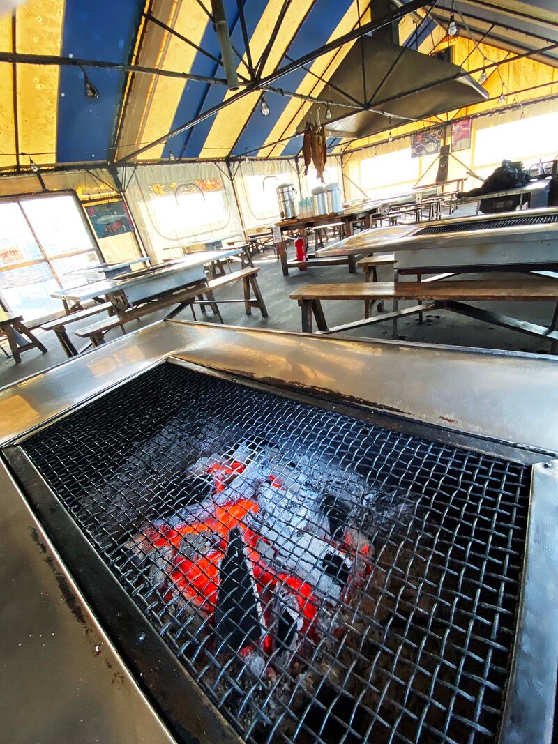 シャケが吊り下げられているのが目印の食堂。ここは魚介類の工場直営の食堂で、客は食べたい魚介類を自分でプレートに乗せて会計。併設されたテントに持っていき、炭火でじっくりと焼いて食べる形式。