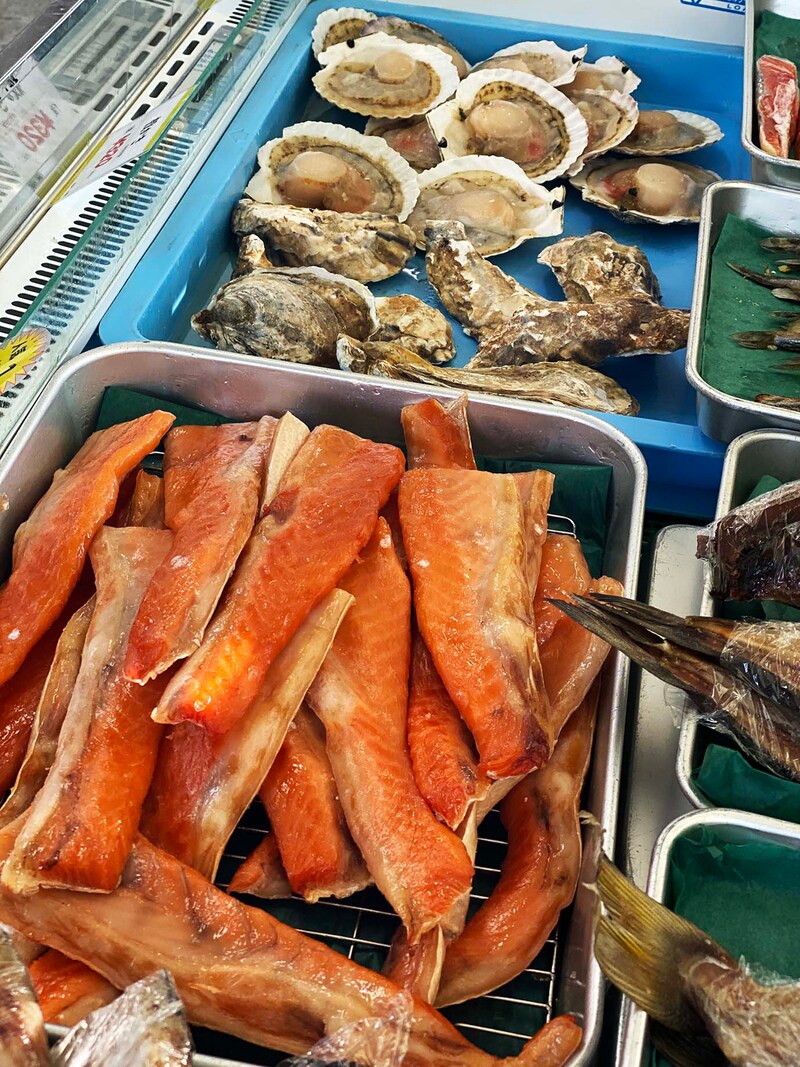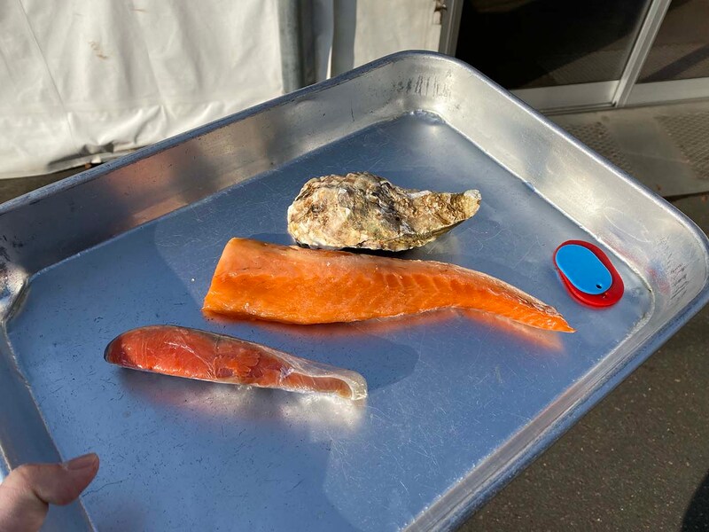 シャケ、ハラス、さんま、ほたて、さば、ほっけ、そして牡蠣など、さまざまな魚介類から選ぶことができるだけでなく、なにより新鮮で安い。一番人気はサーモンハラスとのことで、今回は紅ジャケとサーモンハラスのシャケざんまいに。おまけで牡蠣も足してみた。