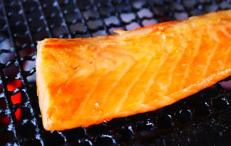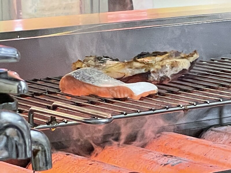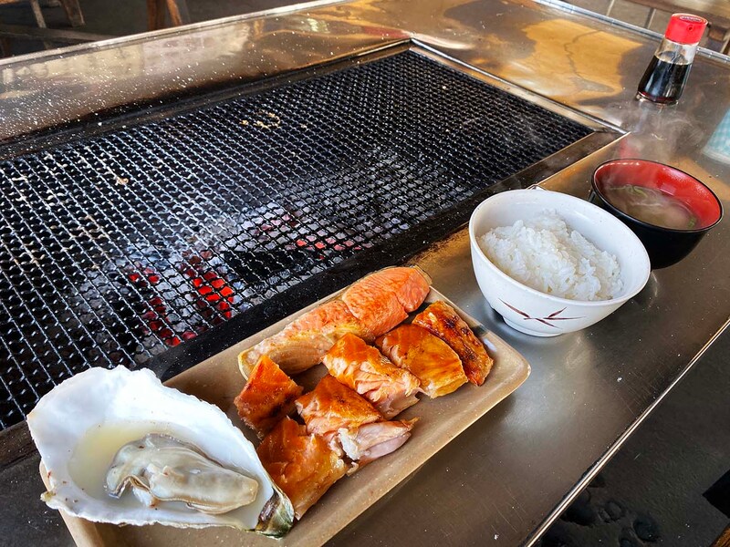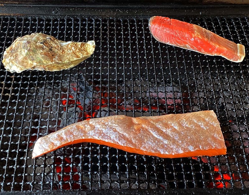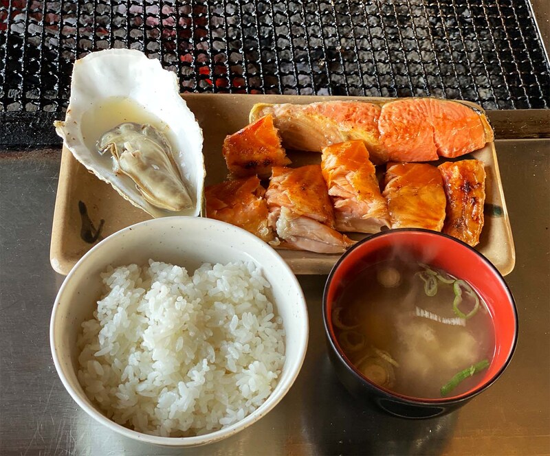 ライスとみそ汁もついてくるので、あとは焼けるのを待てば、立派なシャケ定食(牡蠣つき)の出来上がり! 高温の炭火でじっくりと焼かれるシャケやハラスから、脂が染み出て滴り、煙となって立ち昇る。たまらない美味なる薫り。