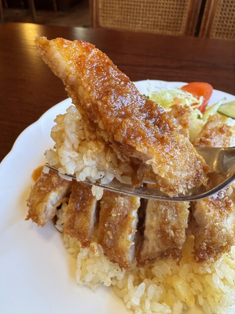 まず、バターライスが凄まじく良い仕事をしている。繊細な塩気とバターの芳醇な薫りとコクを生み、そこにカツがノッて香ばしさと豚肉の旨味を伝えてくるのだ。そう、バターライスがベースとして極めて重要ポイントとなっているのである。