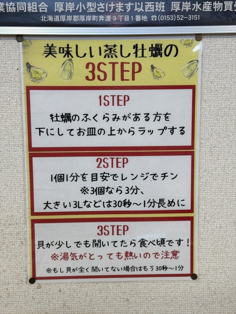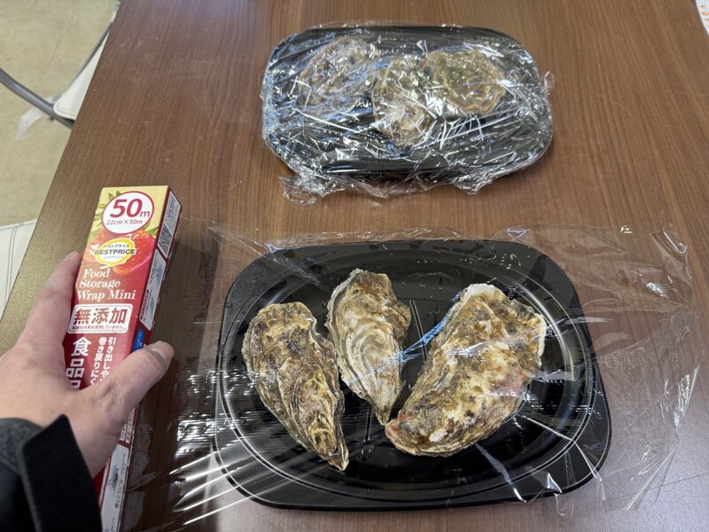 そしてここ、「買った生牡蠣をその場で蒸牡蠣にして食べることができる」という点もステキだ。客は生牡蠣を買い、受け取り、直売所内にある電子レンジで蒸して食べることができるのだ。もちろん、テーブルも椅子も箸もカキナイフもラップも調味料も用意されている神域っぷり。