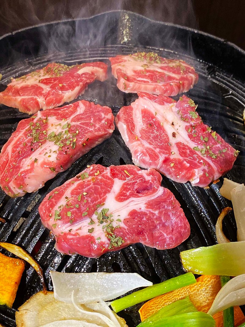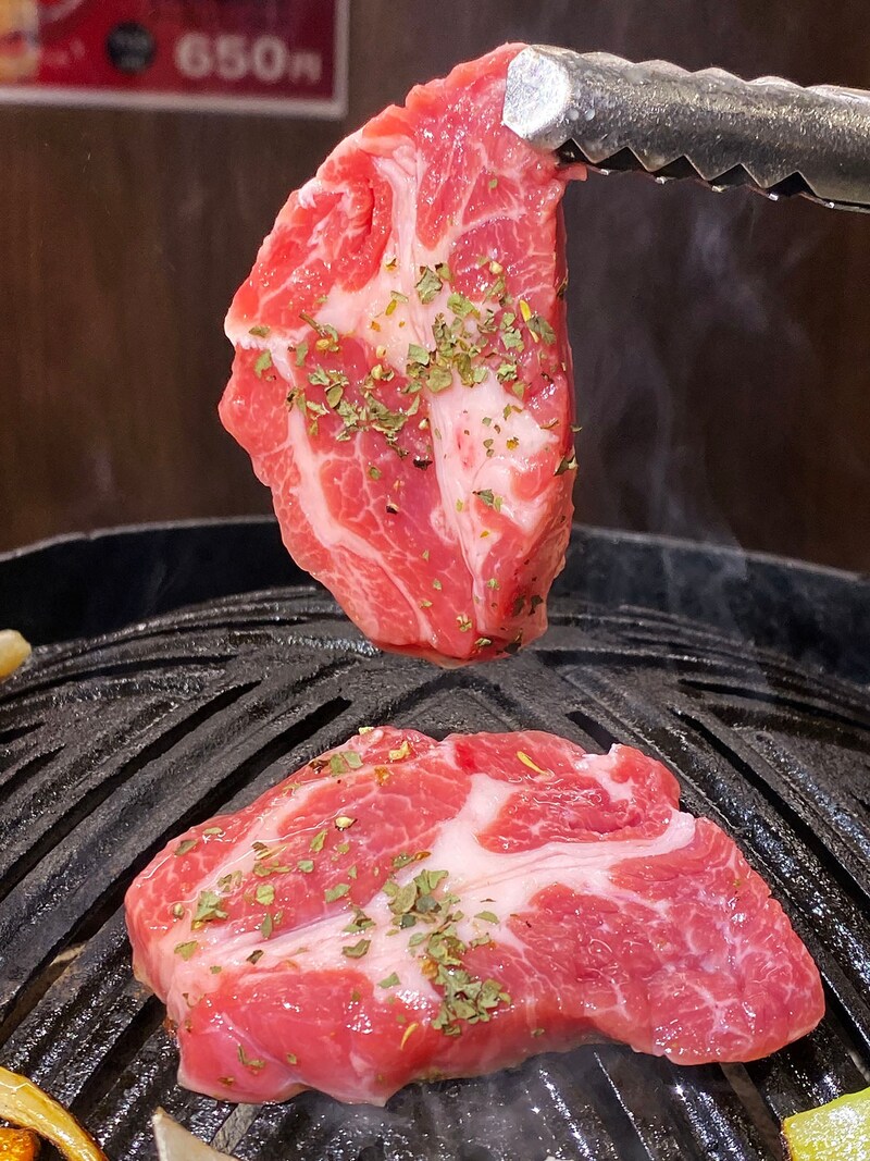 おひとり様、カップル、4人がけ、さまざまなタイプの席が用意されているのが良い感じ。ひとり担当のスタッフがついて、最初だけ最適な焼き加減に仕上げてくれる。ここでどうしても食べたかったのが、ハーブ生ラム(800円)。肩ロースをハーブと岩塩で仕込んだもので、テーブルに出てくるだけでハーブの爽やかな香りが広がる。