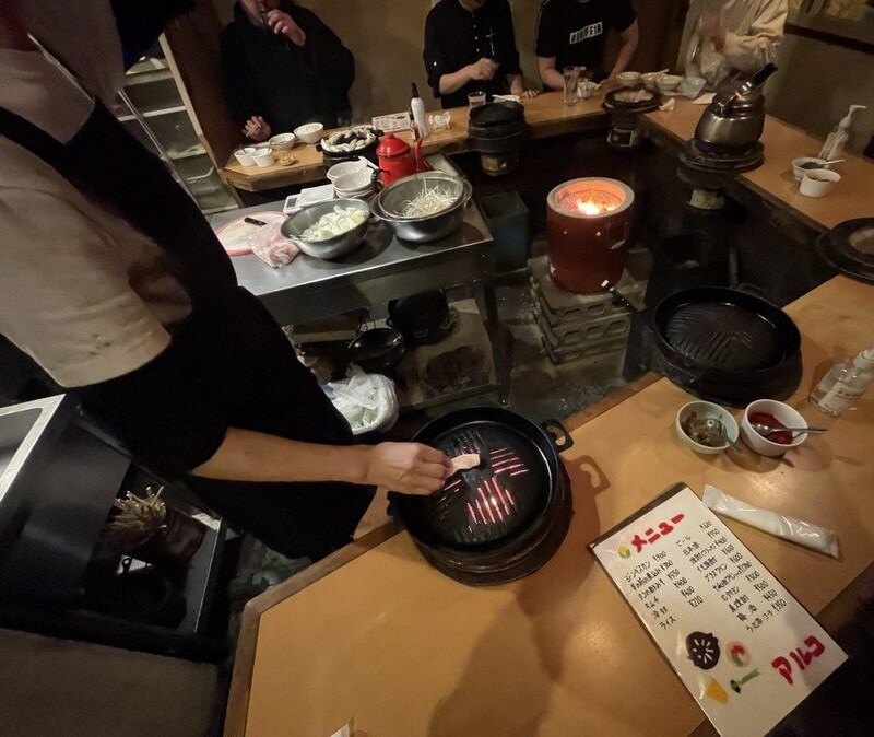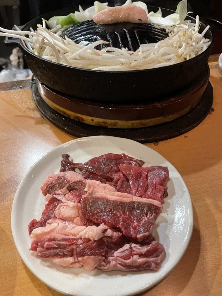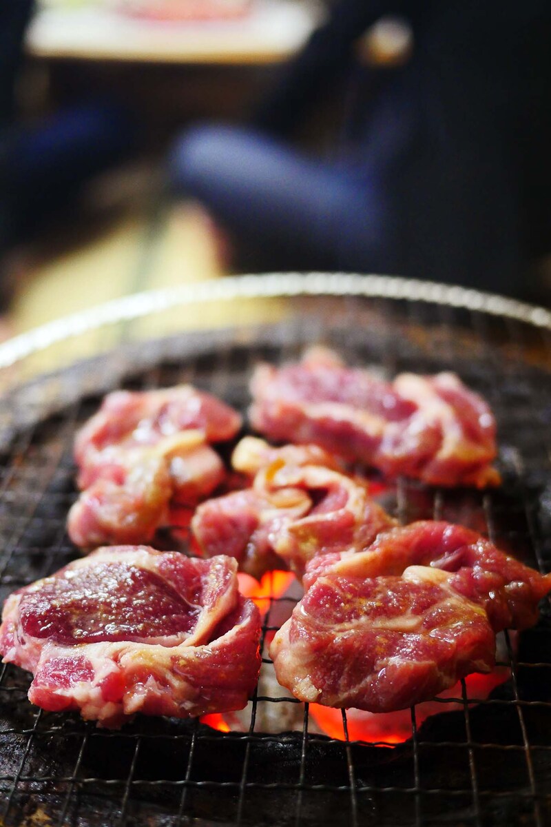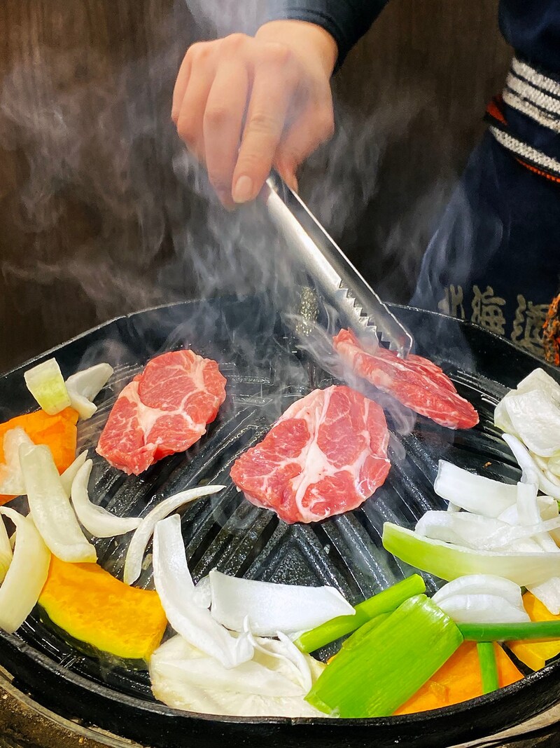 極寒の地だからなのか、二重扉になっているので、重くて厚い扉を開けて、さらに奥の扉を開けて中に入る。店内はジンギスカンが焼ける香ばしい薫りに包まれていて、なにより温かいので天国のようだ。