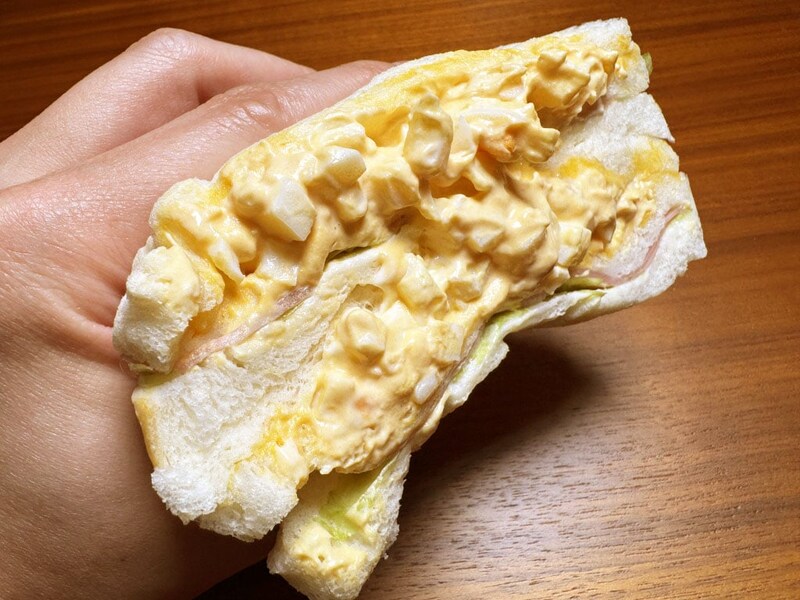 その味、驚くほどおいしい。うまい、うますぎる。ダブルタマコサンドイッチの食パンは超シットリしてて、タマゴはたっぷりトロトロ。あまりにもタマゴが多すぎて、手にするだけであふれてくる。そして強いコクと旨味、たまらない。