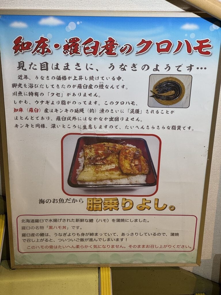 食べてみると、硬すぎない絶妙な弾力で、かなり濃厚な脂の旨味が楽しめた。黒ハモは初めて食べたのだが、これはうなぎとは違った新たな定番になり得るかも。……しかし、世にほとんど流通しない魚のようなので、食べたかったら『道の駅 知床・らうす』に行くしかないかもしれない。