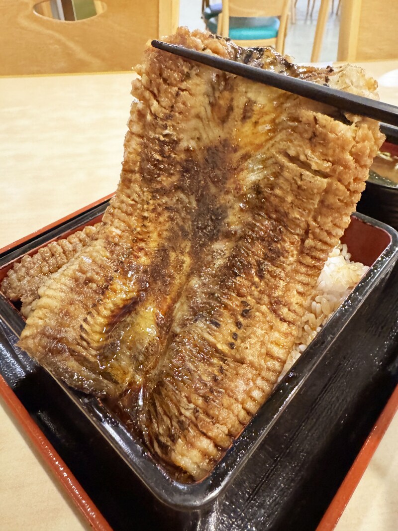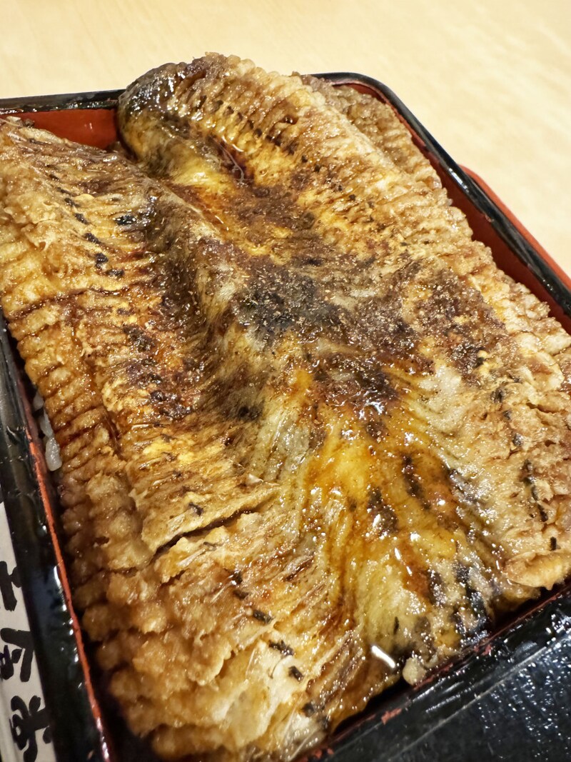 深海魚という時点でレアであり、偶然混獲されるという時点でチョーレアであり、羅臼でしか出回らないことが多いらしいのでガチレア確定。ということで黒ハモ丼を食べてみた。目の前にやってきた黒ハモ丼だが、なんともダイナミック。表面を見ただけで、肉厚であることがわかるし、巨大であることもわかる。あまりにも大きすぎてご飯が見えない。