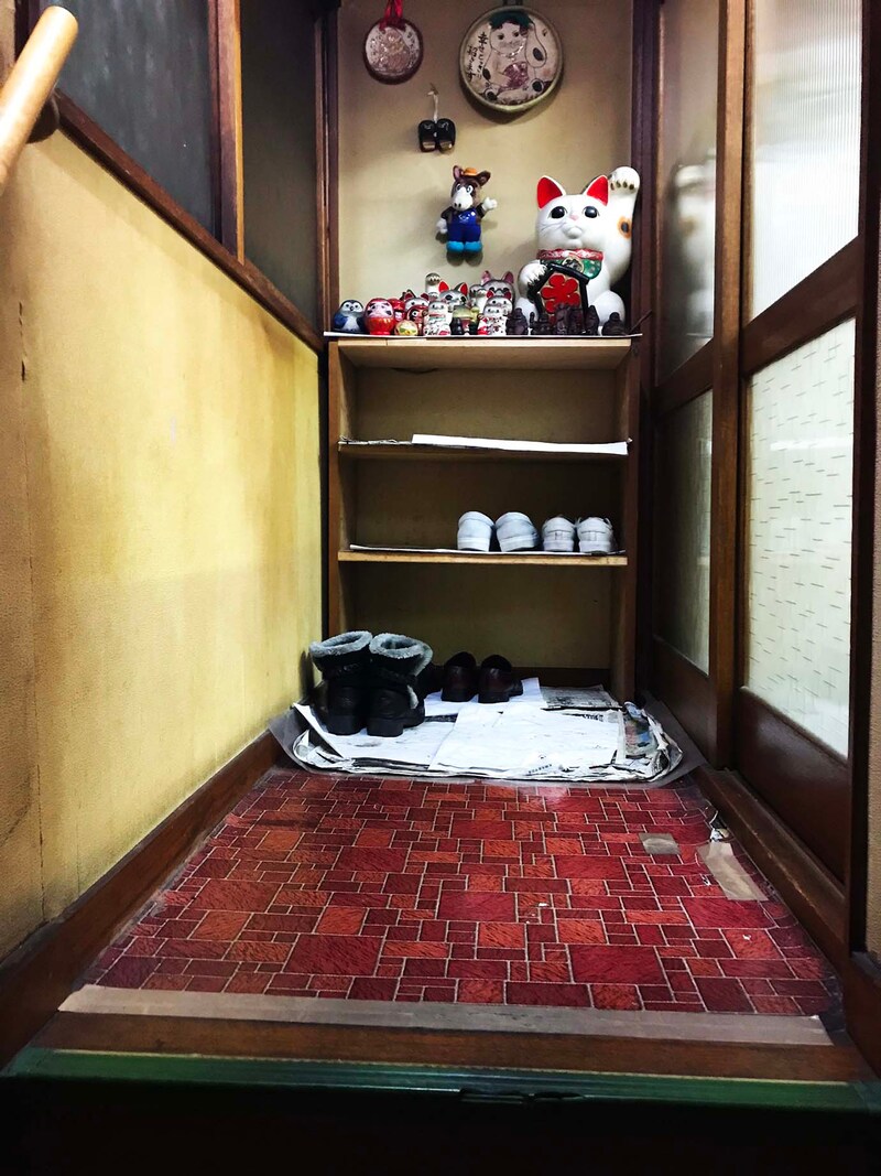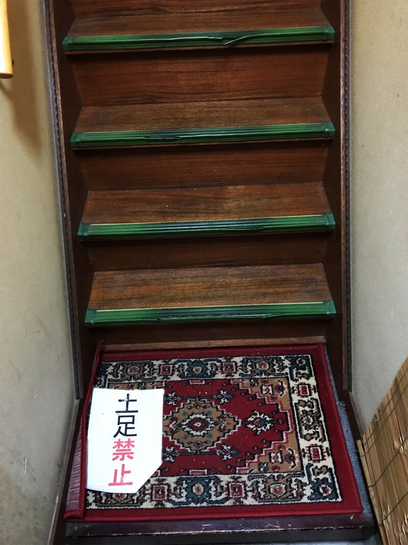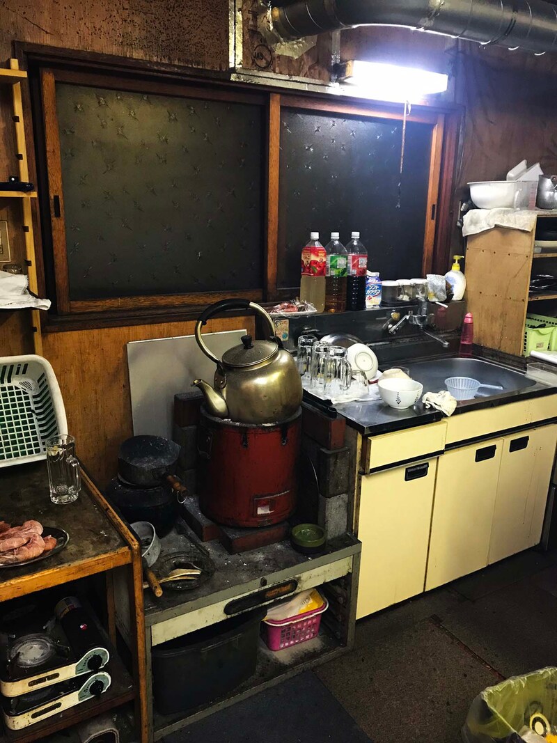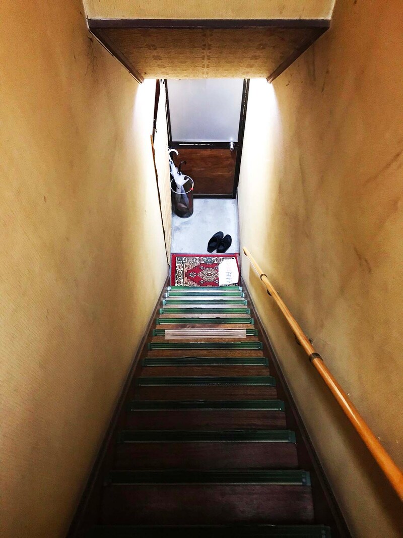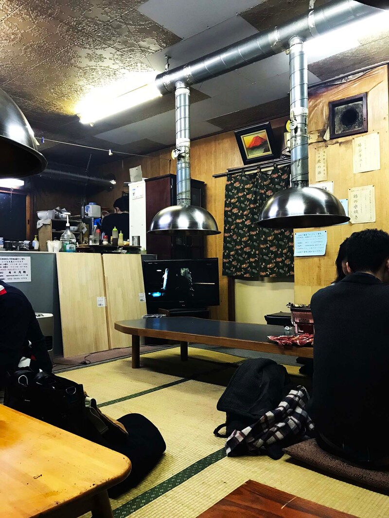 ここに焼肉屋があるの? と思えるほど焼肉屋に見えない建物にあり、ドアを開けて入ると、そこはもうアパート。昭和時代の木造アパート的な雰囲気。急な階段をのぼって2階に上がり、引き戸を開けると、そこでようやく焼肉屋の雰囲気となる。