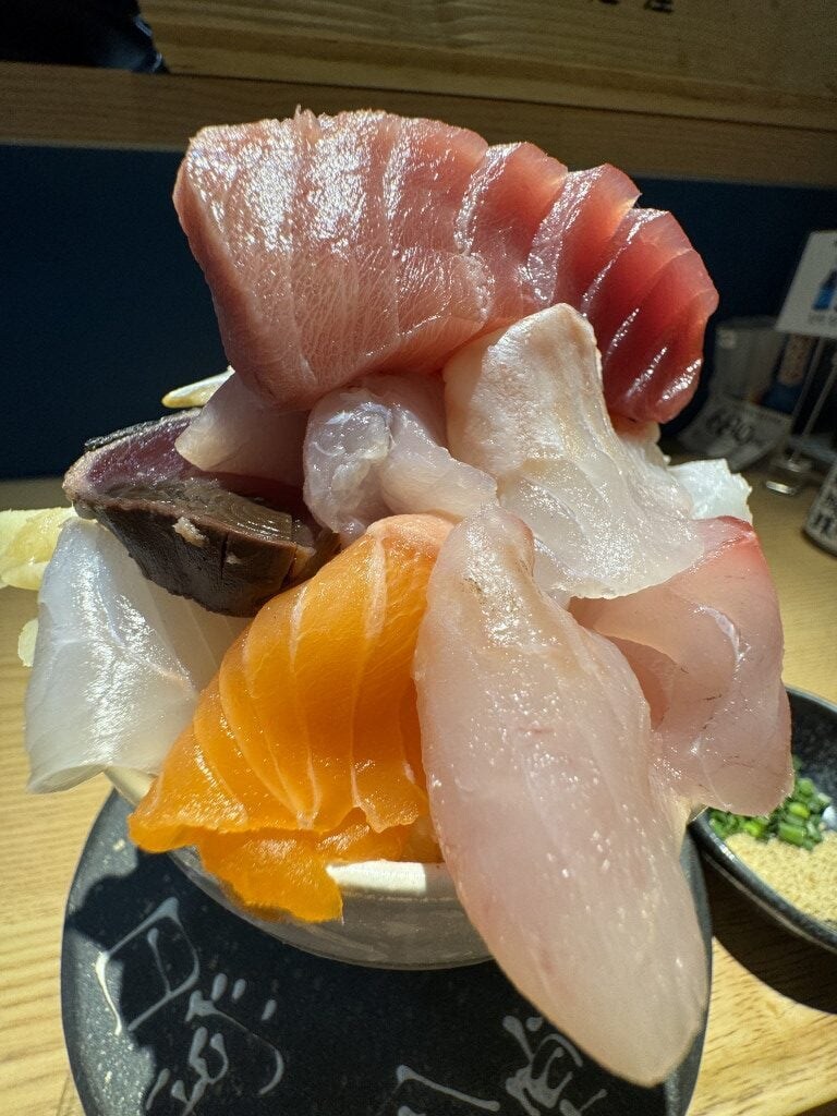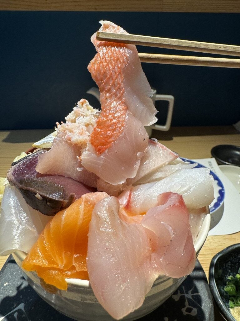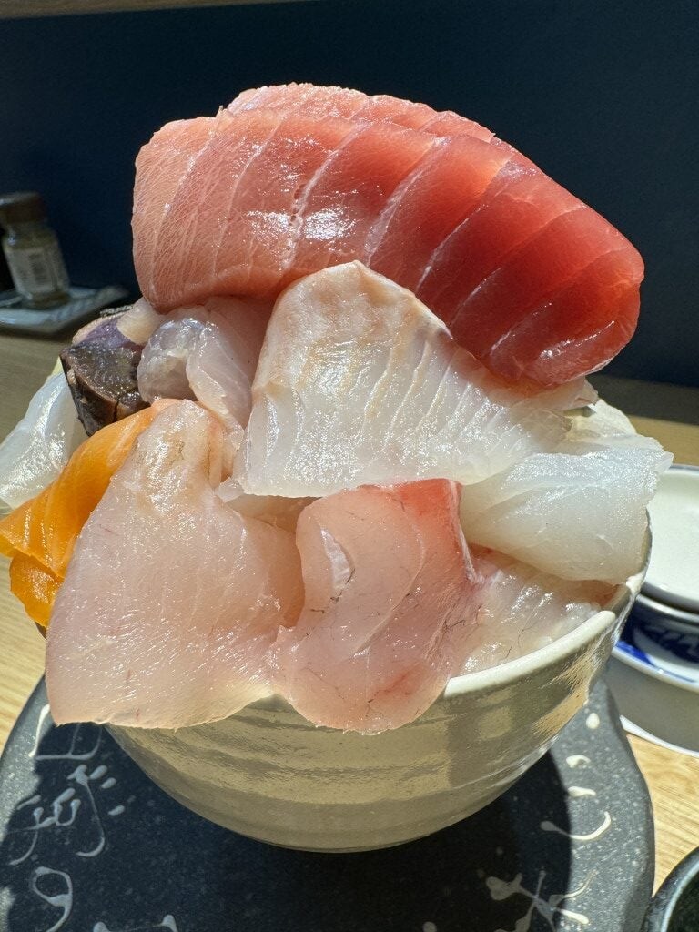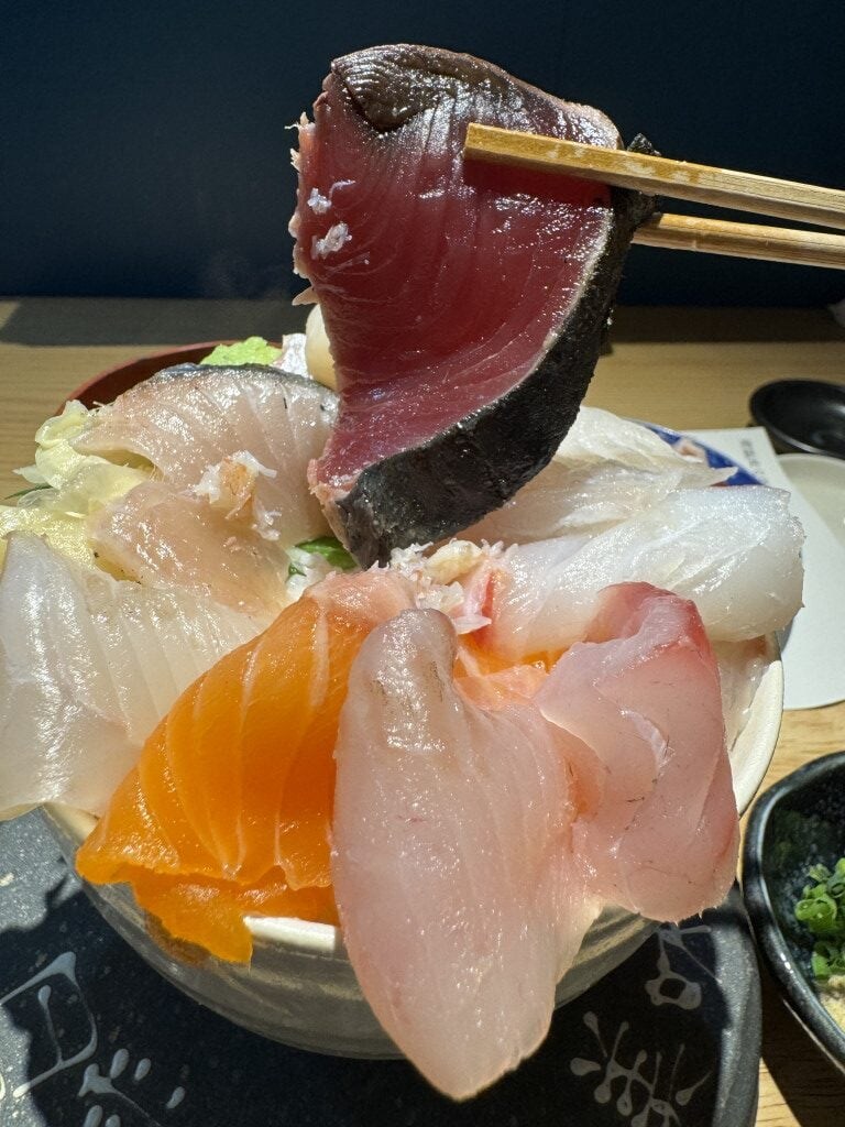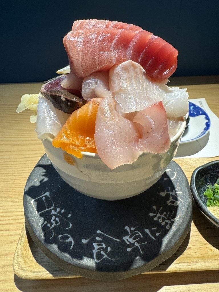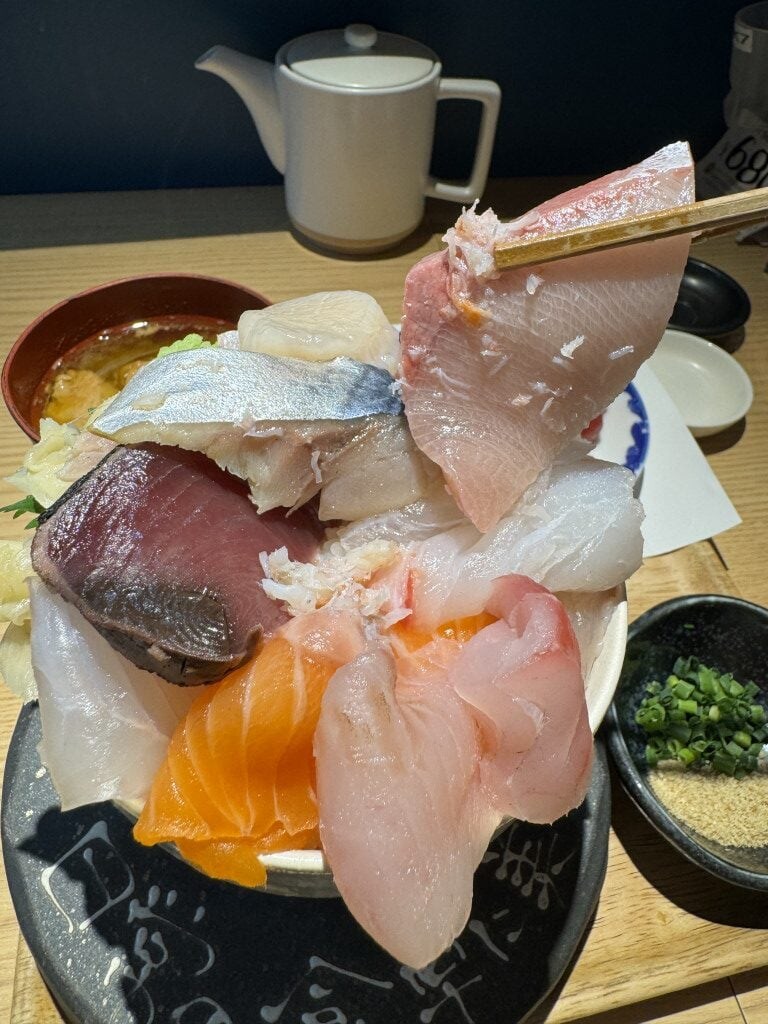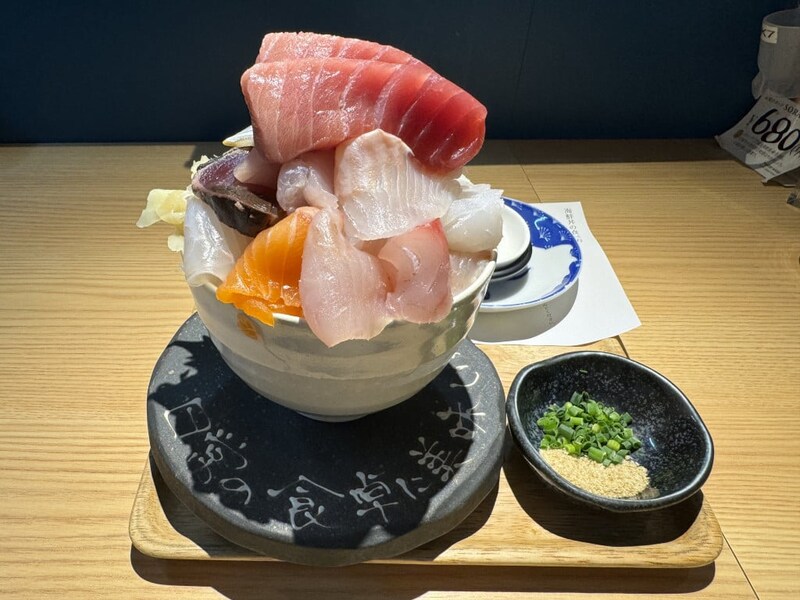 今回は10種類の魚介類が入っている海鮮丼をオーダーしたのだが、店員さんによると、この日は15種類の魚介類が入っているという。それでも価格そのまま。ごらんの通り、驚くほどデカ盛りである。無駄にご飯が多いわけではない。魚介類が多すぎてデカ盛りなのである。つまり、超贅沢。