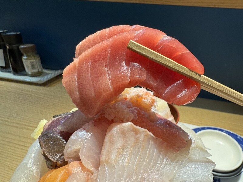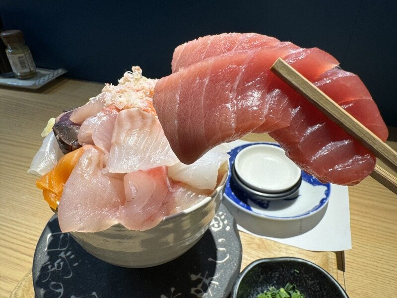 海鮮丼がかなり秀逸。まず、ライス量が過剰に多くないところがベスト。主役である魚介類を楽しめる最適なライス量なのである。そして新鮮な刺身。非の打ち所がないマグロをはじめとした厚切り刺身がどんどんライスを欲しくさせる。