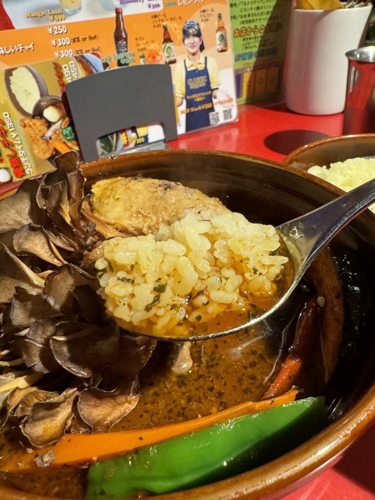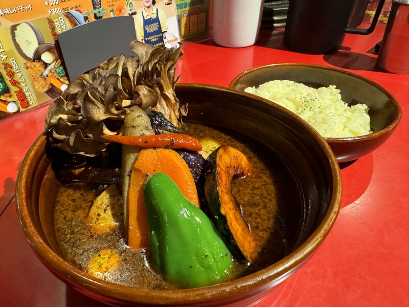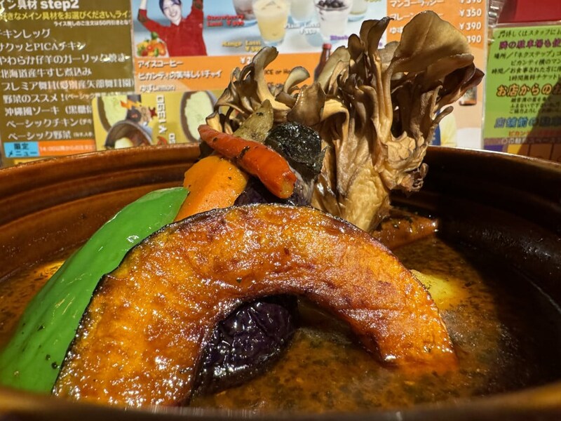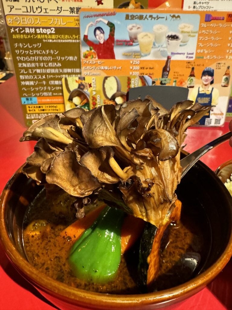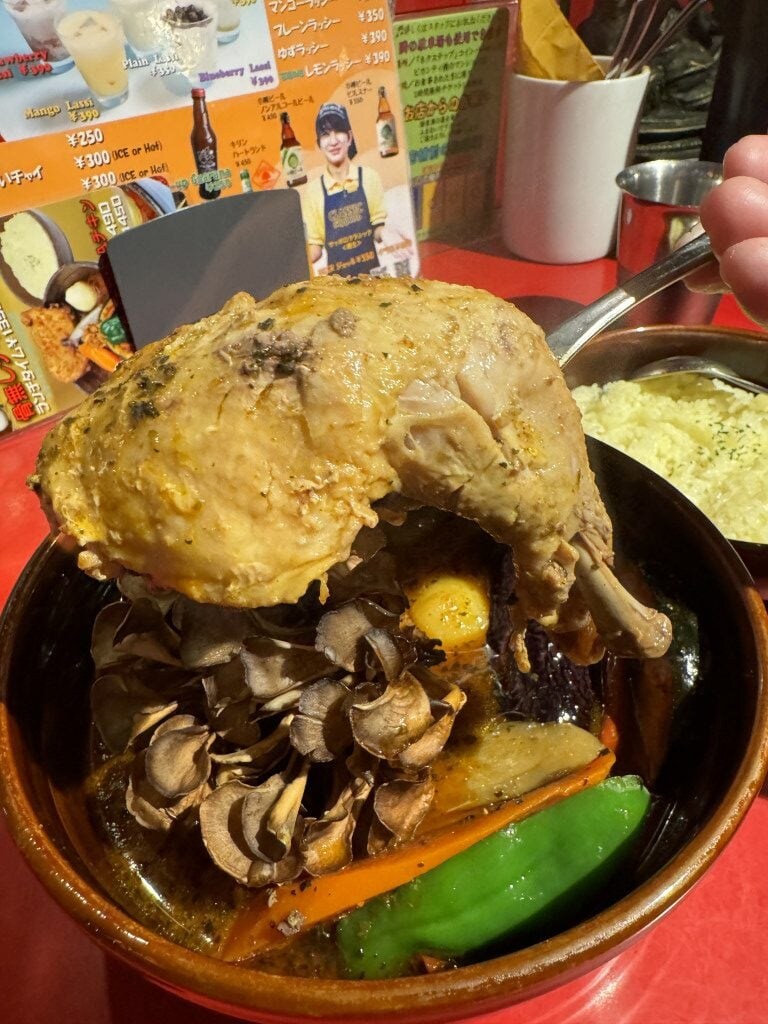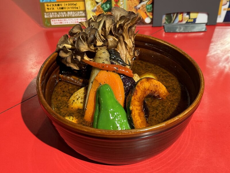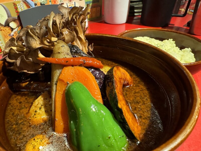 テーブルにやってきたスープカレーは大ボリュームで、かなりの具だくさん。チキンレッグだけでなくプレミアム舞茸もプラスしたので当然大盛りサイズなのは理解できるが、それにしても、プレミアム舞茸がデカい。
