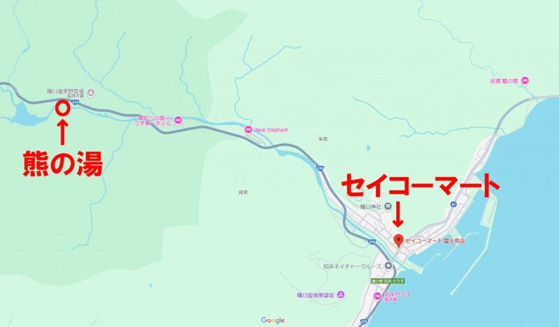 熊の湯には、体を洗う石鹸やシャンプーなどは置いてない。オケはある。もし急に熊の湯に入りたくなったら、セイコーマート(セイコマ)でタオルと石鹸買うとよい。セイコーマートでタオルと石鹸、ついでに湯上り用のペットボトルのお茶を買ってクルマで向かおう。ちなみに、冬季は知床横断道路が春まで通行止めだから、根室海峡側からしか熊の湯に行けない。