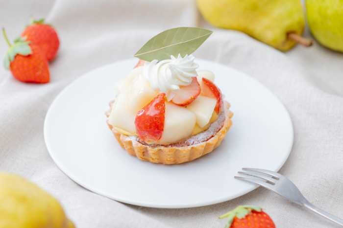 タルトは香ばしい生地にキャラメル風味のカスタードを忍ばせ、苺とラ・フランスのバランスが絶妙♡