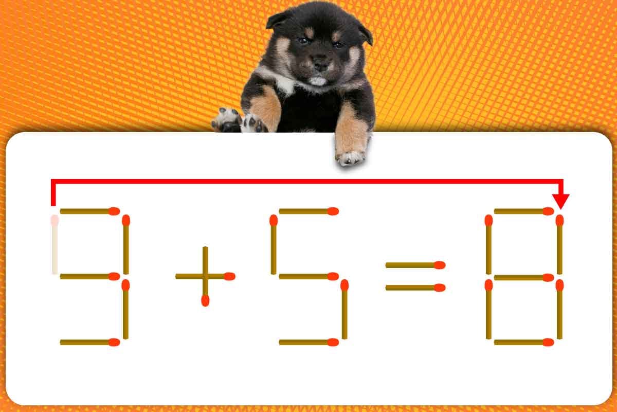 まずは「9」から左上にある縦のマッチ棒を取り、数字を「3」に大きく減らしましょう。そして、取ったマッチ棒を答えである「6」の右上に加えると、数字を「8」に増やすことができます。これで式は「3+5=8」となり、ばっちり式が成立します!