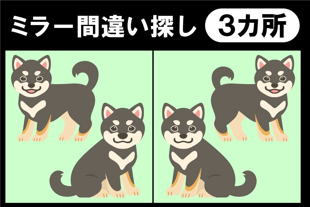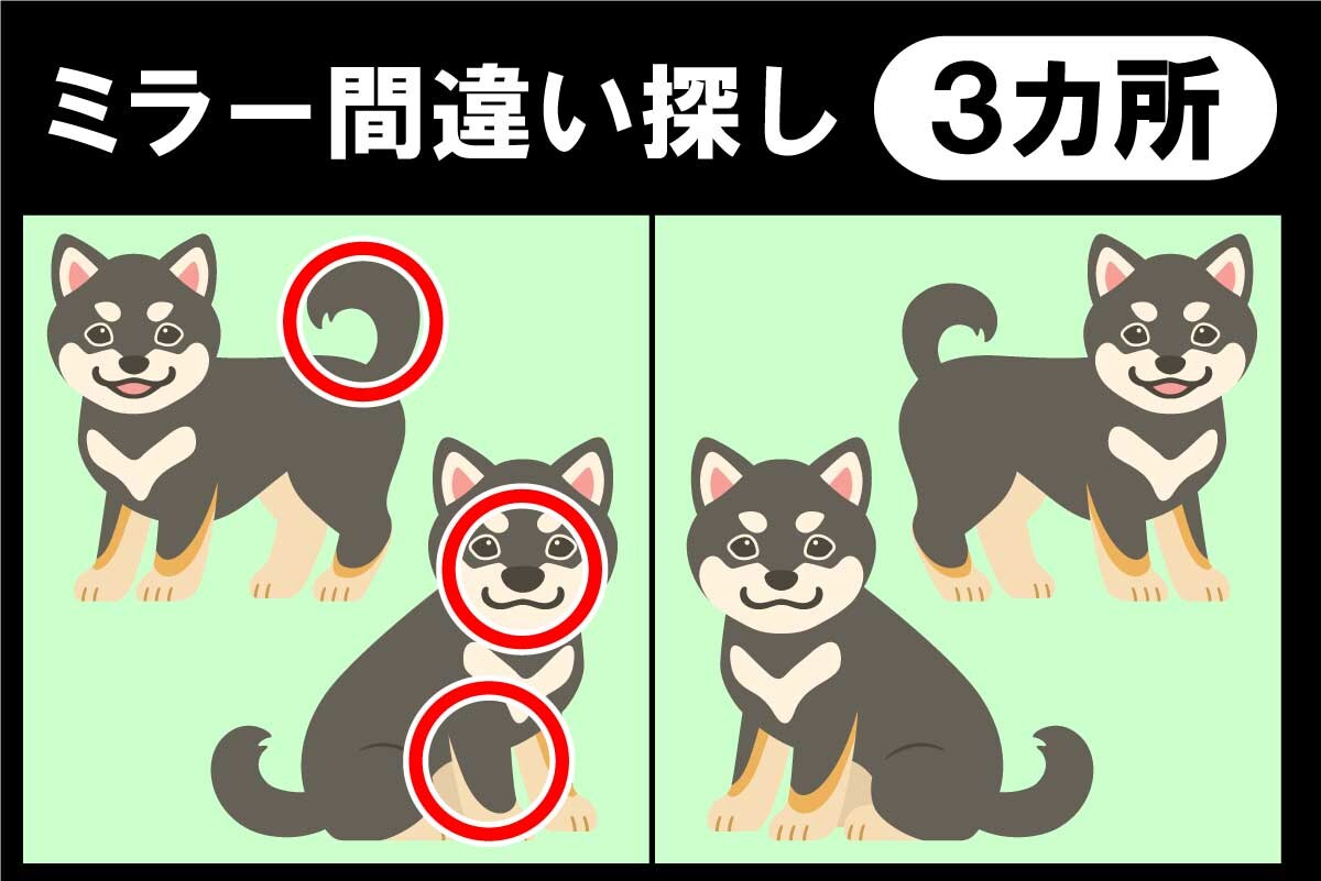 3カ所の違いは、1.上の犬の尻尾の大きさ、2.下の犬の鼻の大きさ、3.下の犬の前足の模様