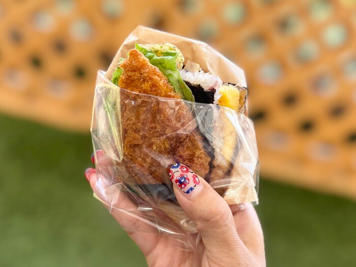 白身フライとちくわ磯部を十六穀米でサンドし、磯の香り豊かな海苔で包み込んだ片手サイズの手持ちグルメ。大屋根リングやお気に入りのスポットで、思わず写真を撮りたくなる一品です。