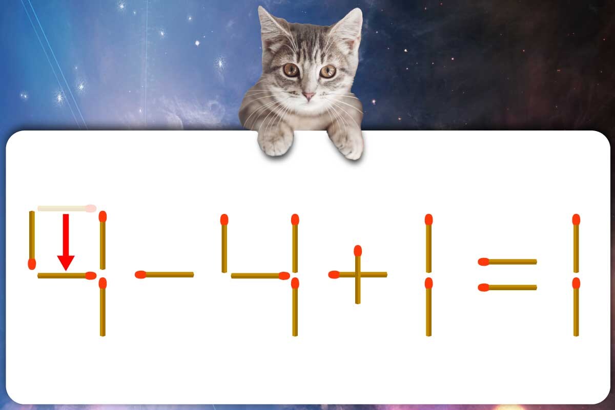 「7」のマッチ棒を1本移動させて「4」を作り、「4-4+1=1」にする。※解答は複数ある場合があります。