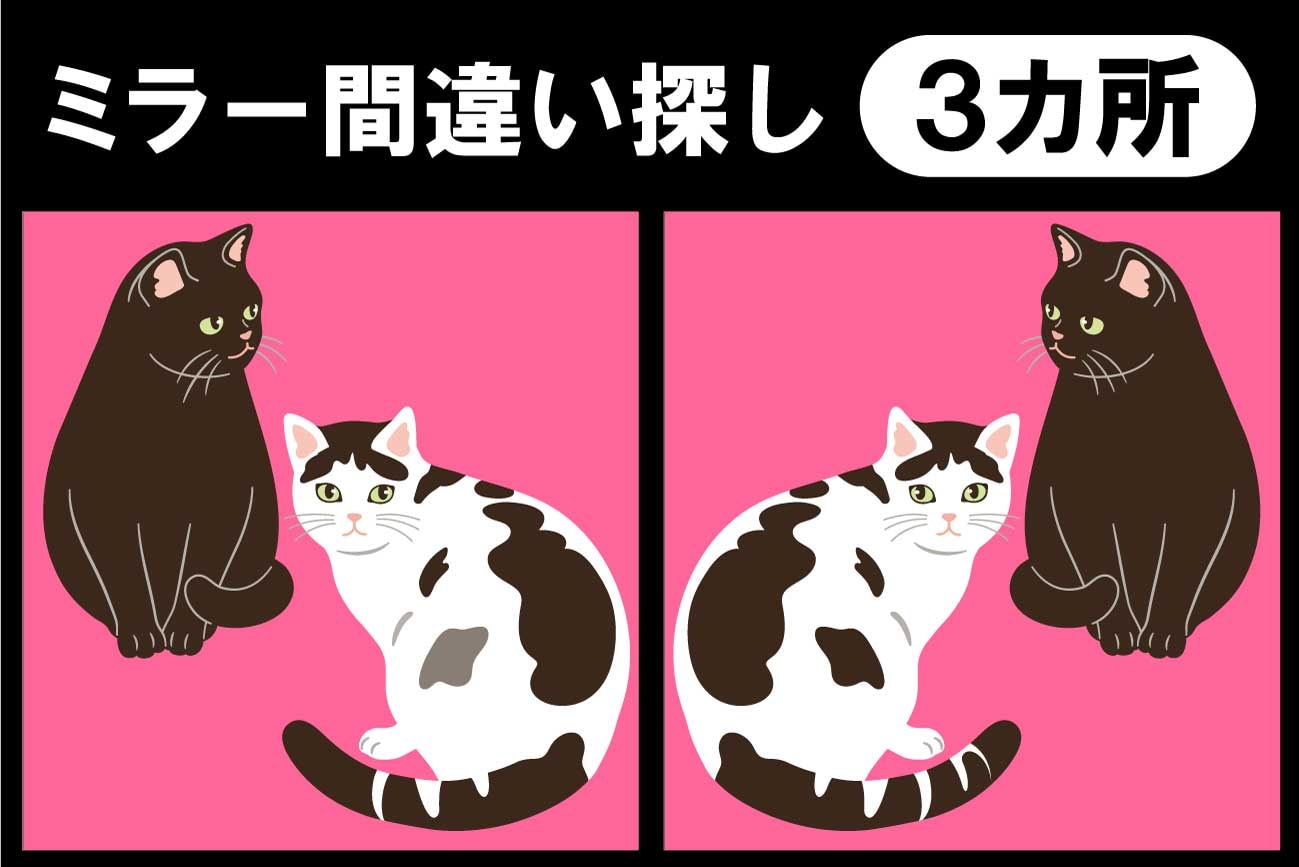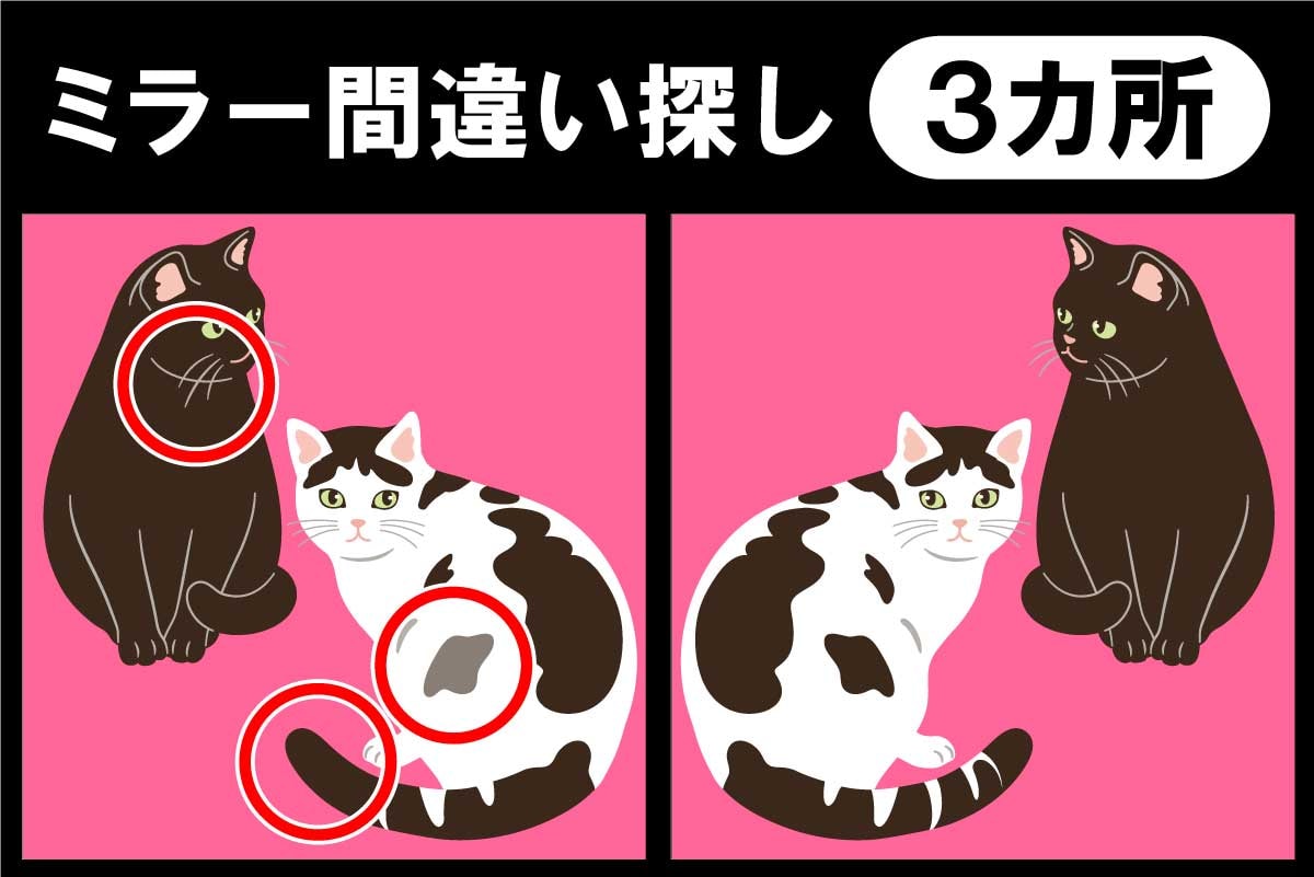 3カ所の違いは、1.黒猫のヒゲの長さ、2.手前の猫の尻尾の模様、3.手前の猫のお腹の模様