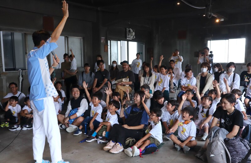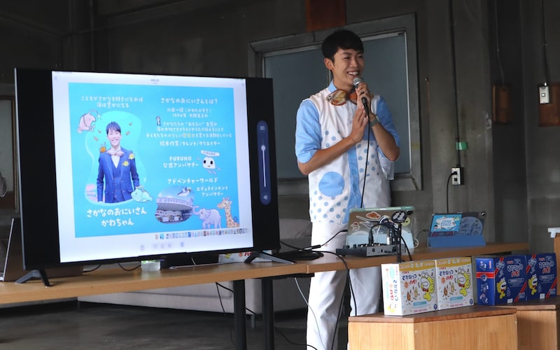 子どもたち全員で大きな声で「かわちゃーん!」と呼びかけると、「さかなのおにいさんかわちゃん」が笑顔で手を振りながら登場! その後はイワシや海の生き物に関するクイズショーなども行われ、盛り上がると同時に子どもも大人も海の環境や生きものの大切さを学ぶひとときに。