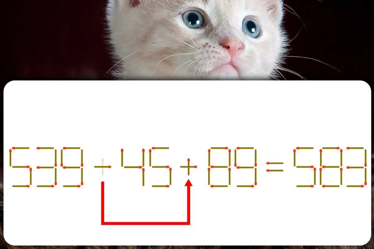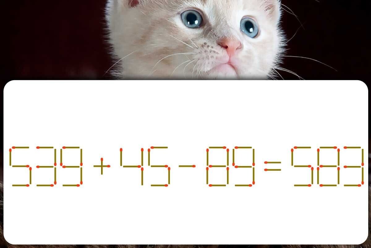 「+」の縦向きのマッチ棒を取り、「-」に足して「+」を作り、「539-45+89=583」にする。※解答は複数ある場合があります。