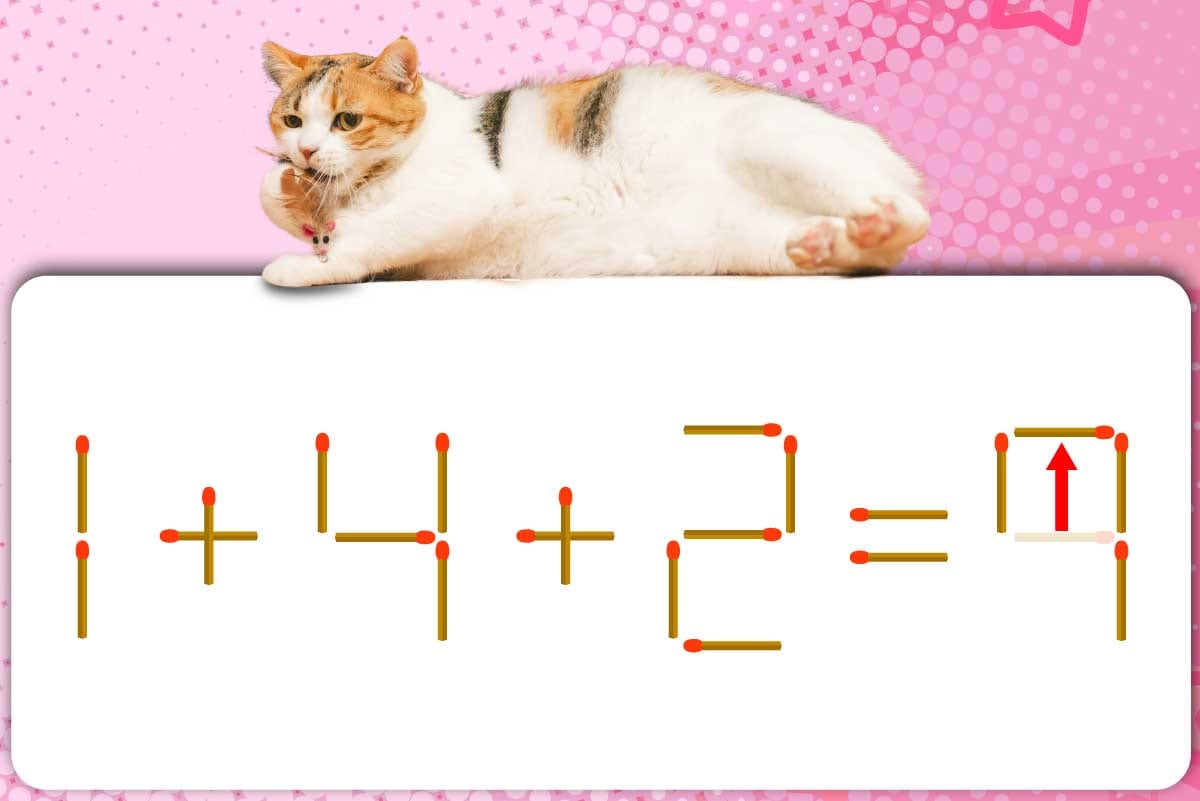「4」のマッチ棒を1本移動させて「7」を作り、「1+4+2=7」にする。※解答は複数ある場合があります。