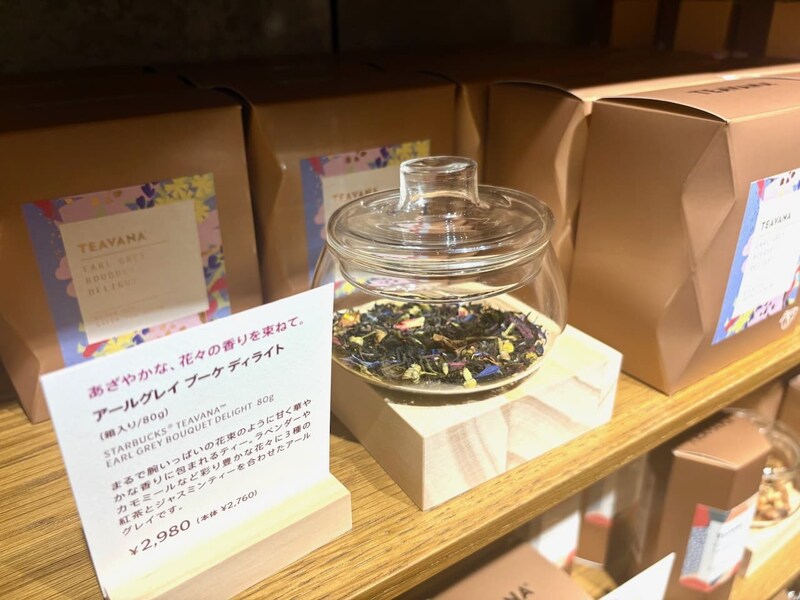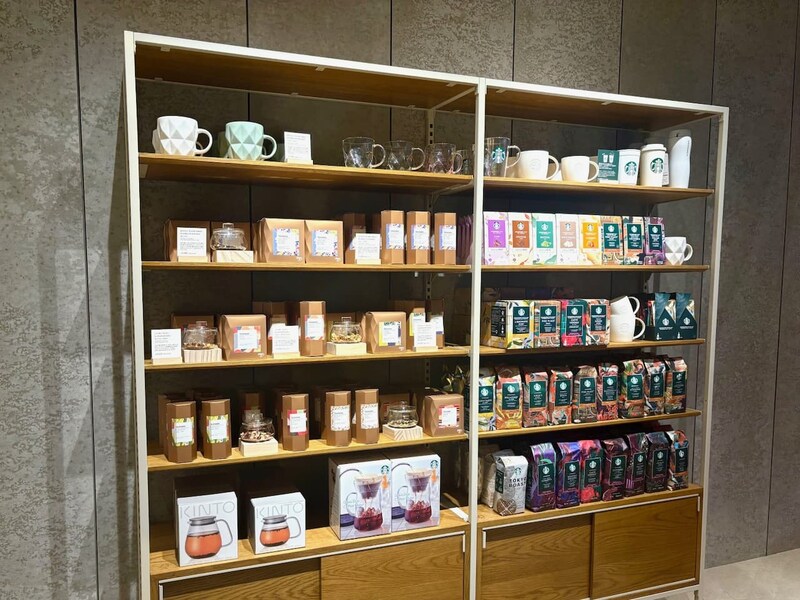店内には、スターバックスの楽しみのひとつでもある物販コーナーも設けられています。ティー特化型店舗でしか購入できない「STARBUCKS(R) TEAVANA(TM)」の茶葉などがそろい、気に入ったブレンドをおうちで味わうこともできます。