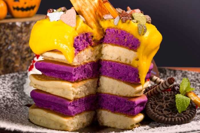 『ハロウィンナイトパンケーキ』は、Eggs ’n Thingsが贈る秋の限定スイーツ。紫芋を使ったパンケーキ生地を重ね、濃厚なパンプキンクリームをたっぷりトッピングした豪華な一品です。