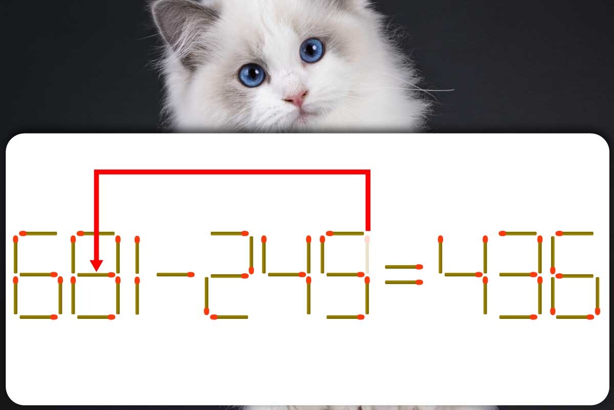 「9」の右上のマッチ棒を、「0」の真ん中に入れて「8」に変化させ、「681-245=436」にする。※解答は複数ある場合があります。