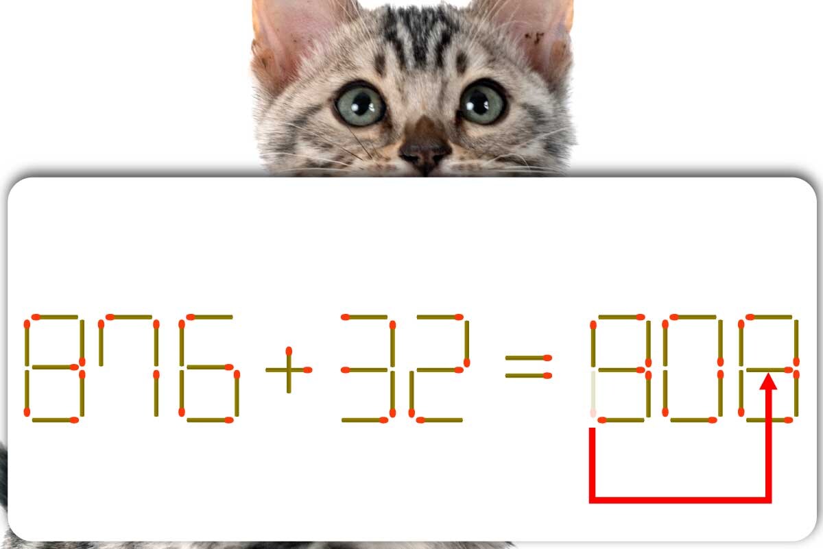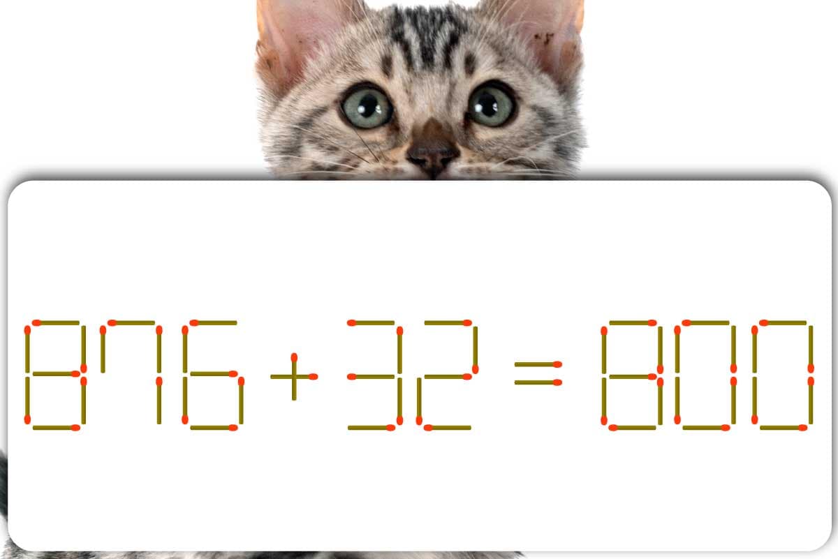 まずは「800」の「8」に注目。左下の1本を横に向けて2つ隣の「0」の中心へ動かしましょう。すると「876+32=908」となり、正しい式に! ※解答は複数ある場合があります。