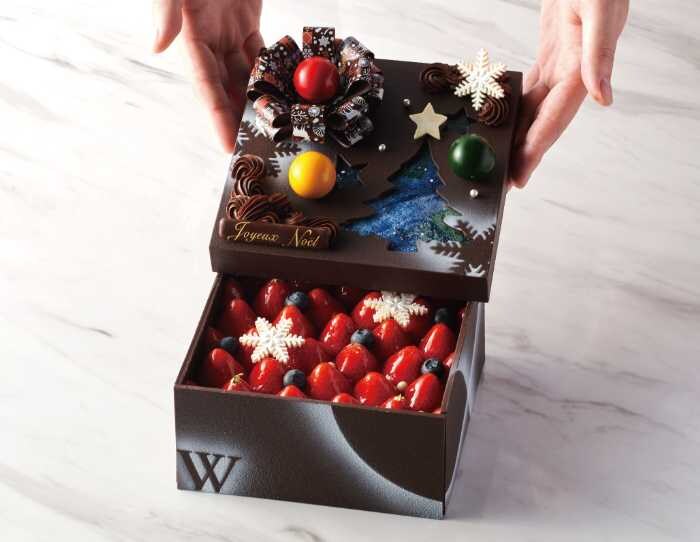 蓋を開けると苺が艶やかに並び、ラムレーズン入りミルクチョコムースやガトーショコラ、ベリームースで奥深い味わいに。予約受付は10月10日(金)~11月30日(日)、販売は12月23日(火)~25日(木)です。