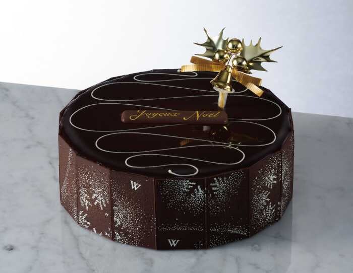 ショコラ サンバは、ビターチョコムースでミルクチョコを包み、雪の結晶チョコをトッピング。10.5cm ¥3,780~18cm ¥6,588(税込)。