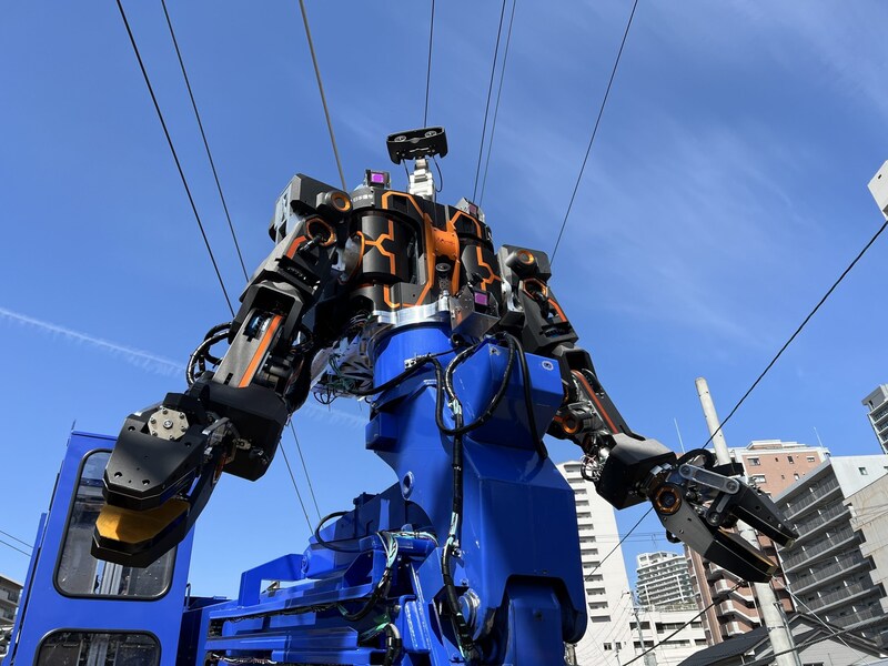 「零式人機 ver.2.0」は、JR西日本グループと日本信号、人機一体が共同開発した汎用人型重機の試作機。全高約2mの胴体を高所作業車のブームに接続することで、地上約12mの高所で稼働が可能。遠隔操作で危険な高所作業を安全かつ精緻に実施できる。