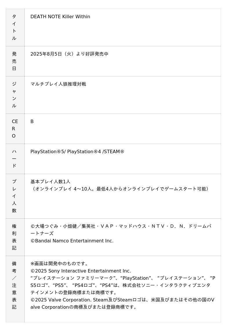 株式会社バンダイナムコエンターテインメントは、PlayStation(R)5/ PlayStation(R)4 /STEAM(R)向けソフト「DEATH NOTE Killer Within」にて、本日2025年8月27日(水)に無料アップデートを配信したことをお知らせいたします。