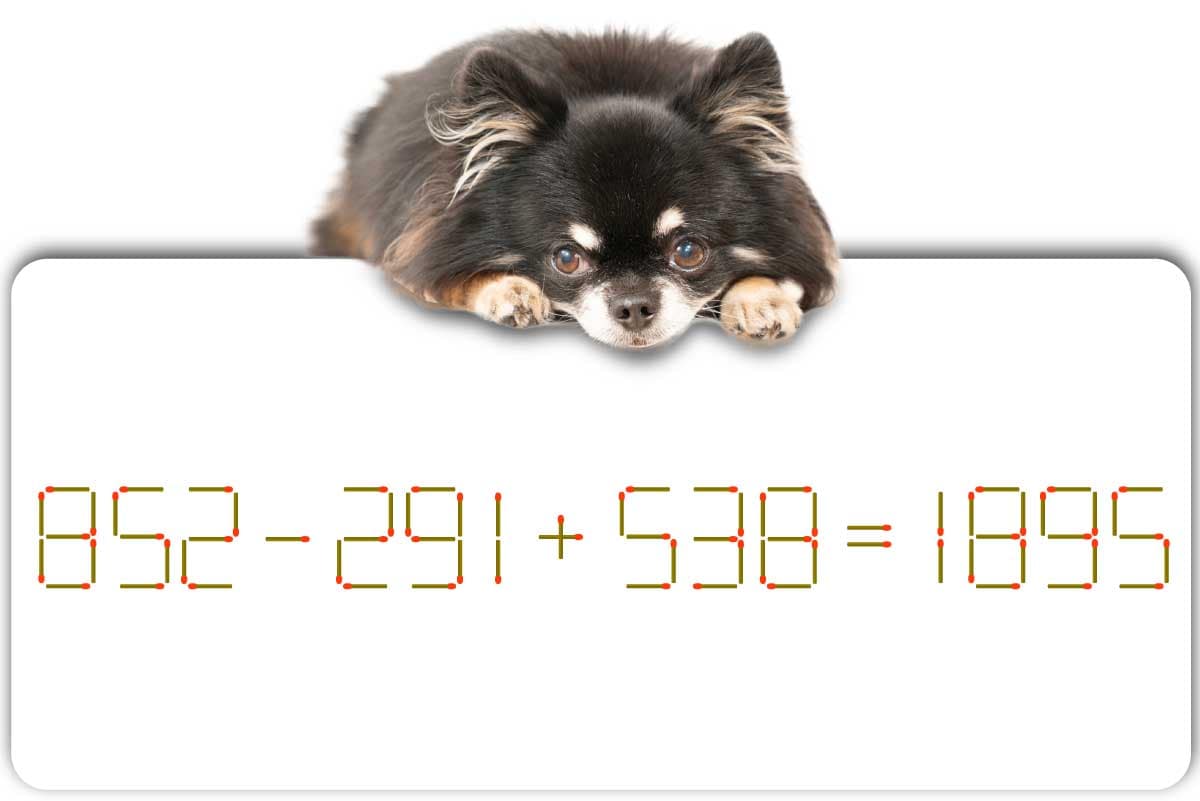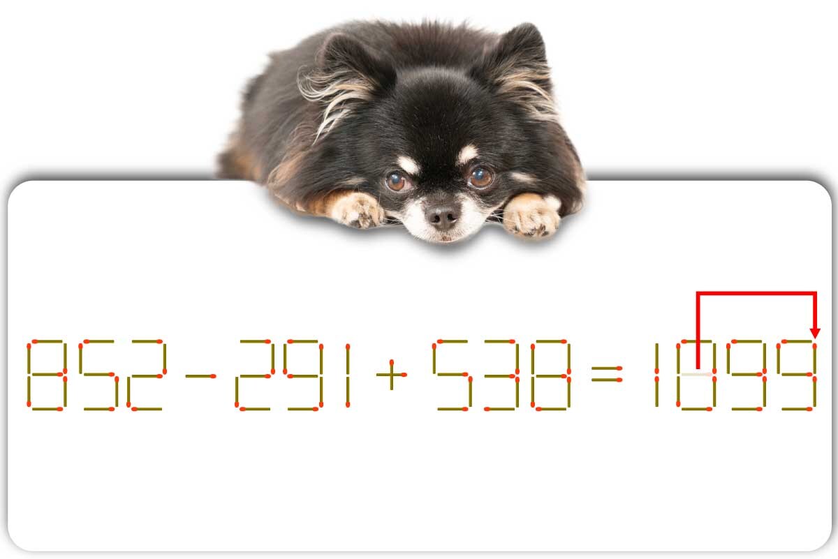 「8」の真ん中のマッチ棒を縦にして、2つ隣の「5」の右上に持っていきましょう。すると「852-291+538=1099」となり、正しい式として成立しました。※解答は複数ある場合があります。