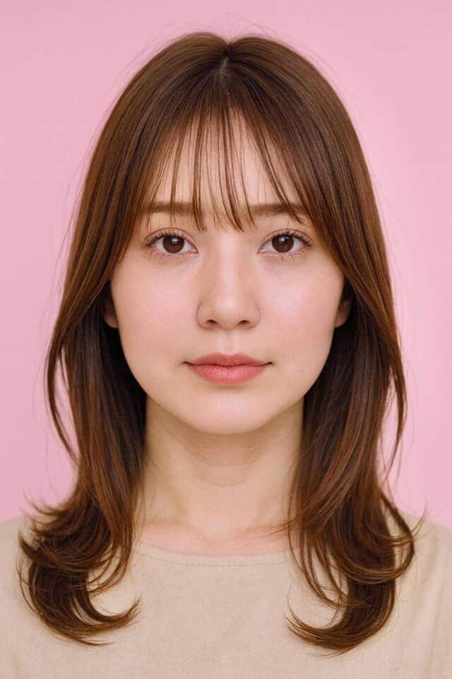 長さは眉ライン前後にすると、目元が明るくなり、自然な抜け感が生まれます。ミディアム〜ロングの前髪ありヘアは、コテで少し流すだけでも柔らかさが加わり、印象をぐっと若々しく見せてくれます。