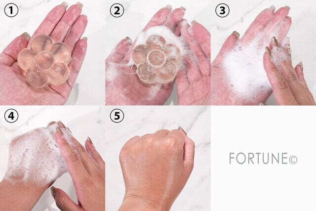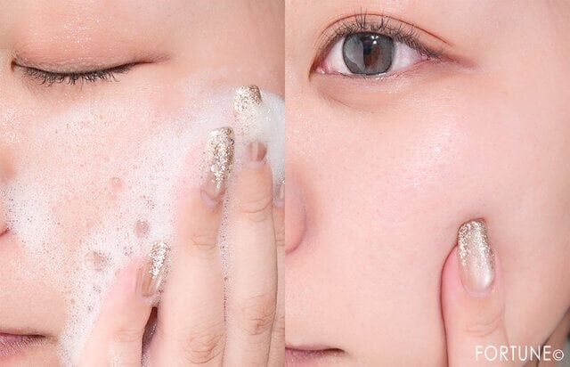 使う際は、水かぬるま湯で泡立ててから、顔全体を包み込むようにやさしく洗います。