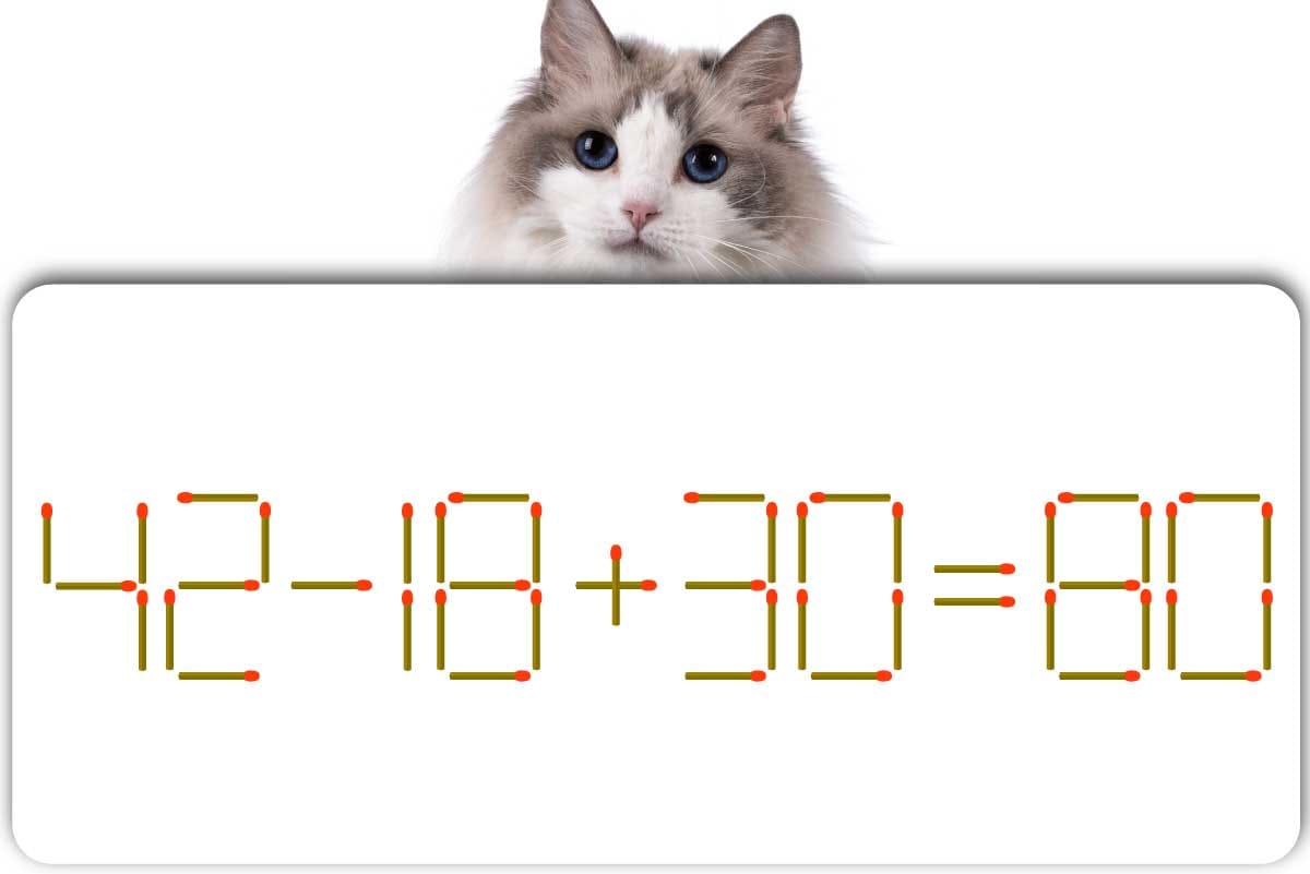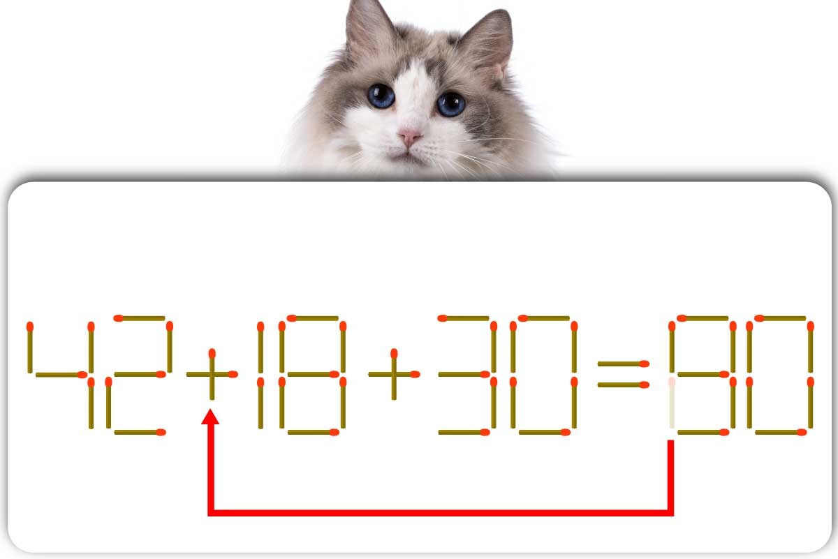 右側の「8」の、左下にある縦向きのマッチ棒を取ります。取ったマッチ棒を「42」の隣の「-」に足して「+」にしましょう。すると、式が「42+18+30=90」に変化し、正しい式になりました。