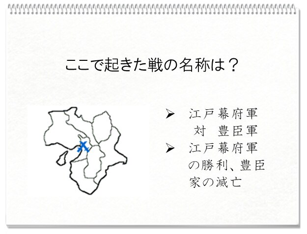 【答】 大坂の陣(おおさかのじん)江戸幕府の成立後、豊臣家は徳川家に臣従せず、諸大名の中で別格の地位を保っていました。徳川家康はこれを憂い、豊臣家の処分を計画。二度にわたる戦いの末に豊臣家は滅亡し、戦国時代以来の大規模な戦闘が終息しました。