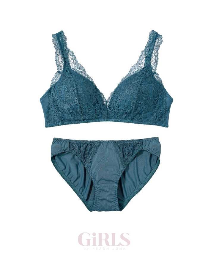 「りらこれレーシィノンワイヤーブラセット」(税込¥2,178)は、締めつけ感が苦手な方にぴったり。繊細なストレッチレースを贅沢に使ったデザインで、新色のブルーグリーンが仲間入り。