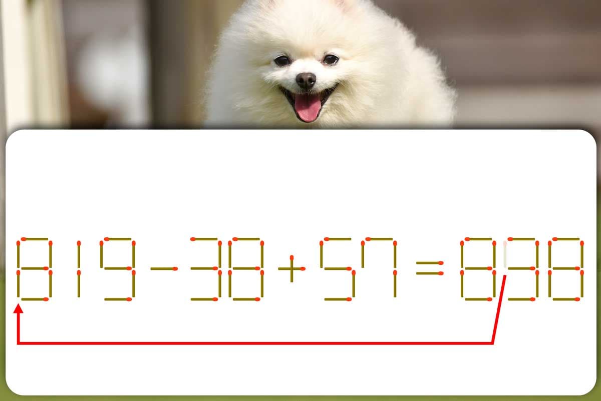動かすのは「898」の「9」の左上のマッチ棒。縦向きのまま、式の頭にある「9」の左下に持っていきましょう。すると「819-38+57=838」となり、正しい式に! ※解答は複数ある場合があります。