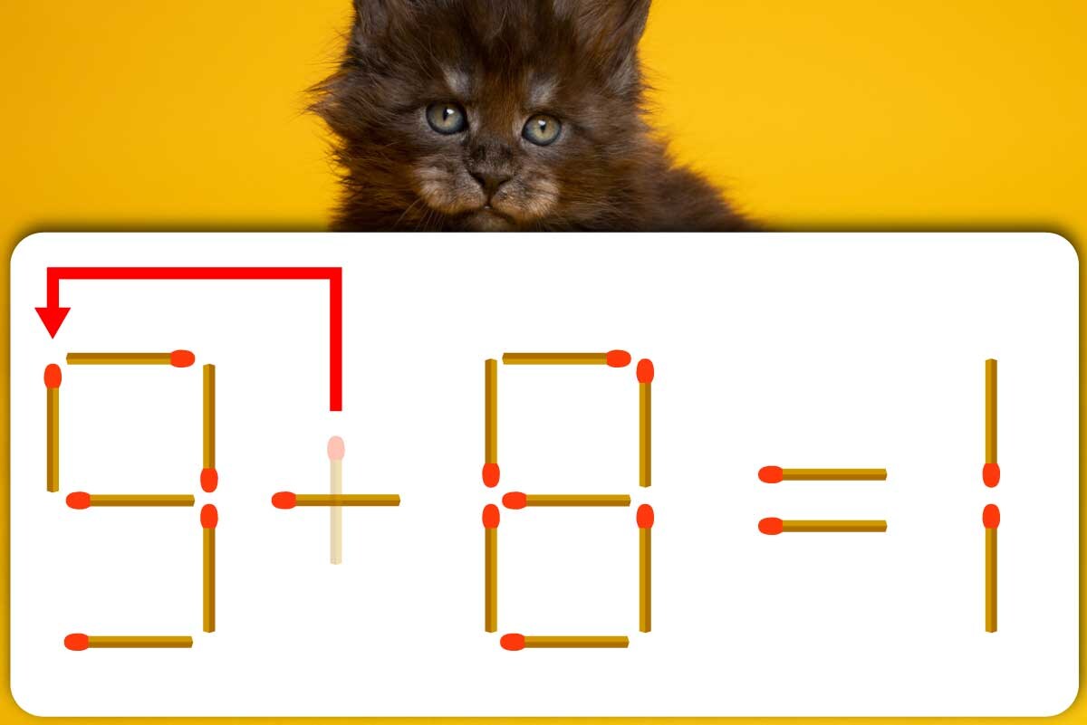 「+」のマッチ棒を1本、「3」に移動させて「9」を作り「9-8=1」にする。