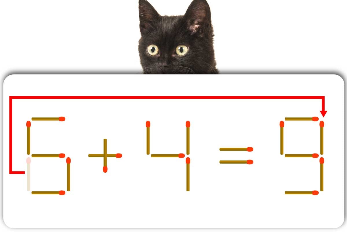 答えの「5」を動かすことができないので、取るマッチは式のほうにあるということがわかりました。最初に左の「6」から、左下にある縦向きのマッチ棒を取り、数字を「5」にしましょう。そこから答えの「5」の右上にマッチ棒をくっつけて「9」にすれば……。見事「5+4=9」となり、綺麗な数式が完成しました!