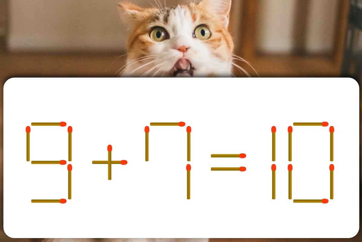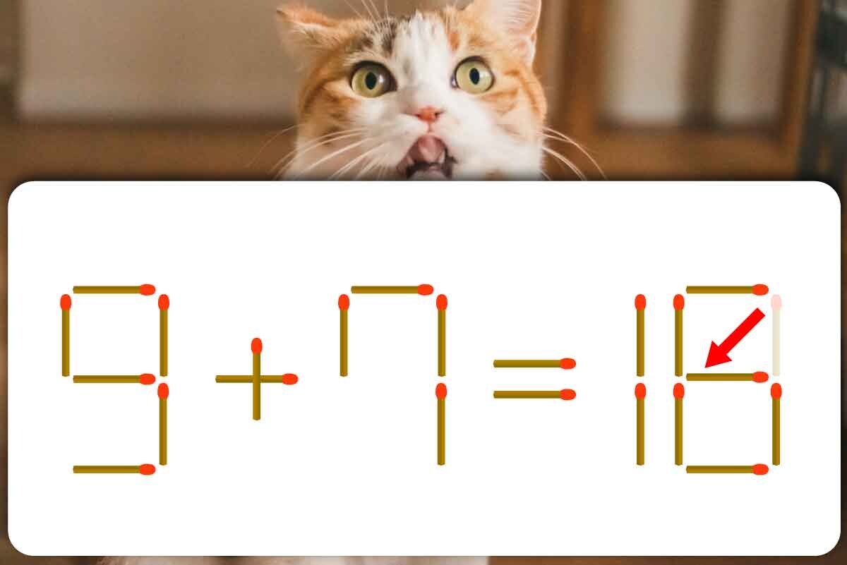 まずは、答えの「10」から、「0」の右上にある縦向きのマッチ棒を取ります。そのまま左に90度倒すと、「0」が「6」にチェンジ! 答えが「16」に変化します。こうすることで式が「9+7=16」になるため、数式が見事に完成しました。