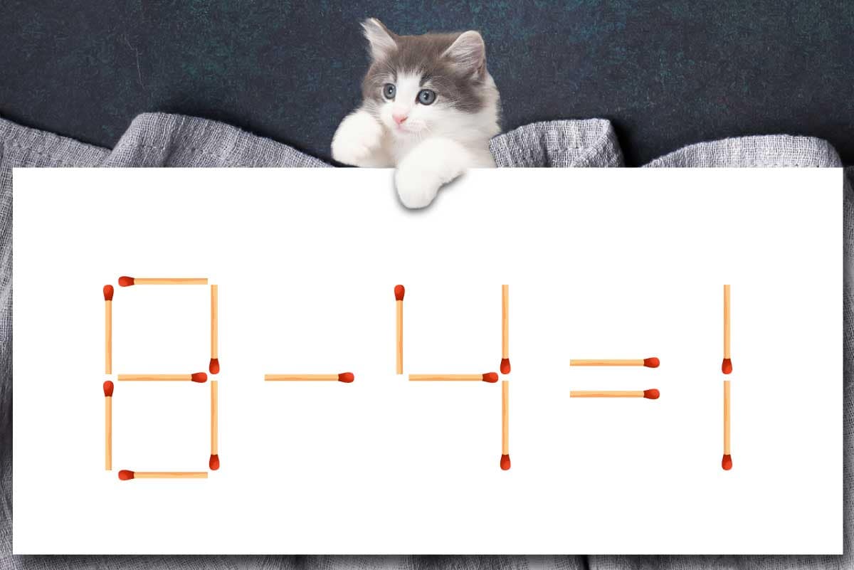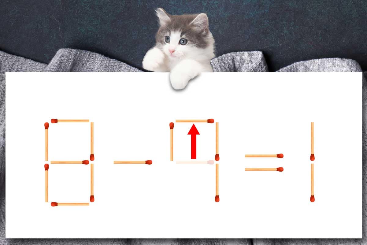 「4」のマッチ棒を1本移動させて「7」を作り、「8-7=1」にする。※解答は複数ある場合があります。