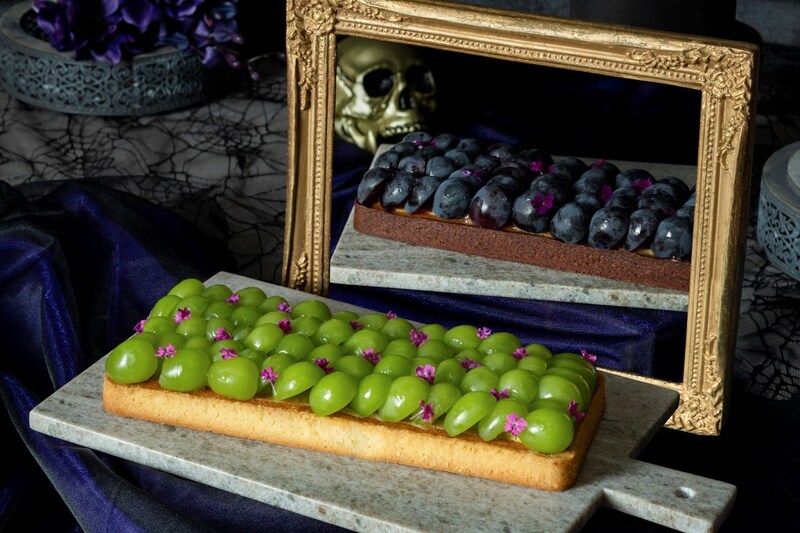 「ドリーミングフレッシュマスカットタルト」(手前)、「ナイトメアフレッシュグレープタルト」(鏡の中)
