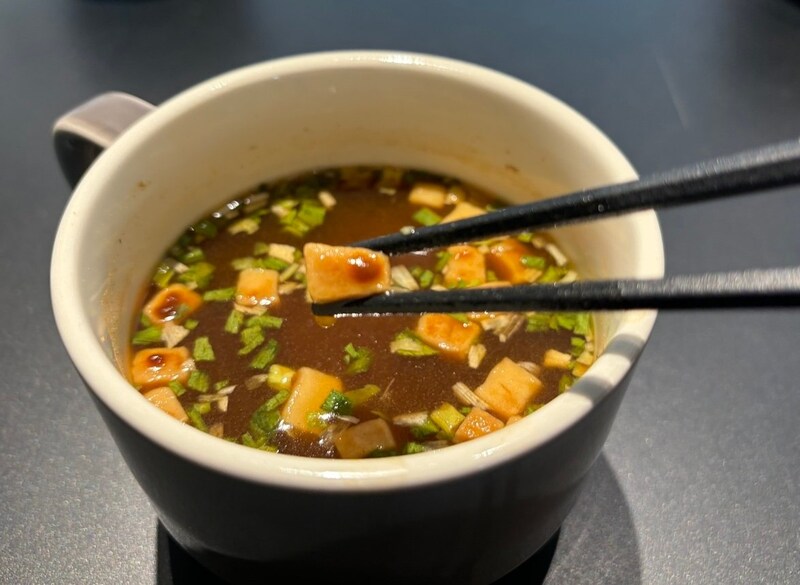 ……え、これ本当に同じかつおだし? と混乱。ガツンとくる赤味噌の濃厚なコクに全く負けていない、だしの力強い存在感に驚愕。豆腐とわかめというシンプルな具が、この重厚な味のハーモニーを完璧にまとめています。白米が無限に食べられそうな、もはや「おかず」レベルの一杯です。