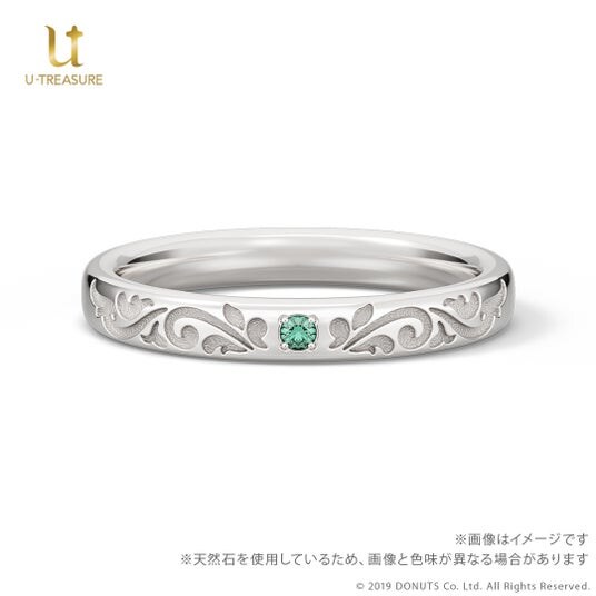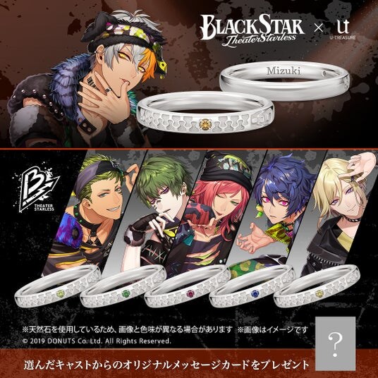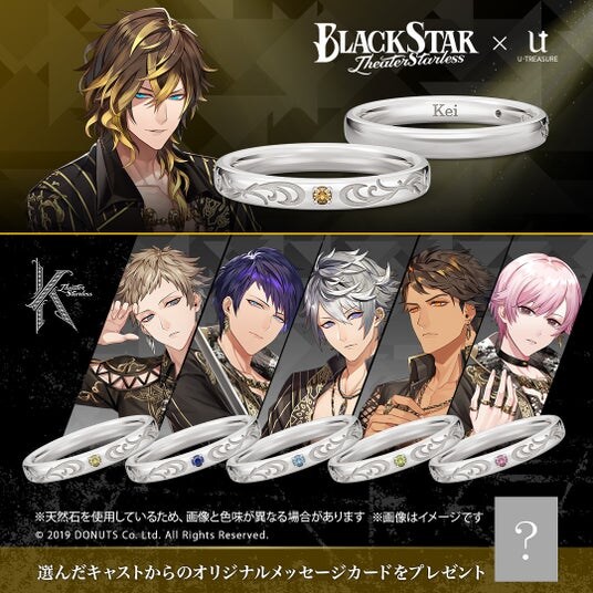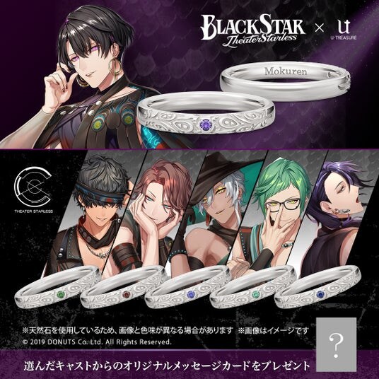 このたびの新作は、『ブラックスター -Theater Starless-』のキャストをモチーフにしたリング(指輪)です。中央にキャストをイメージした天然石を留め、内側には名前を刻印したデザインです。