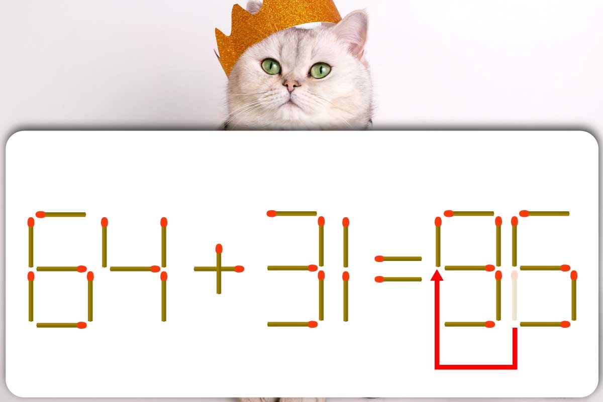 右側の答えの「6」から、左下にある縦向きのマッチ棒を取ります。取ったマッチ棒を、答えの「3」の左上につけましょう。すると、「3」が「9」になり、「6」が「5」に変化!右側の答えが、「95」になったことで、「64+31=95」と両辺の数が一致しました。