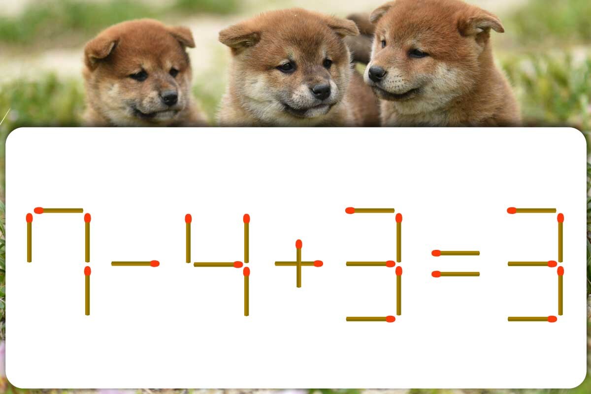 「7」のマッチ棒を1本移動させて「4」を作り、「4-4+3=3」にする。※解答は複数ある場合があります。