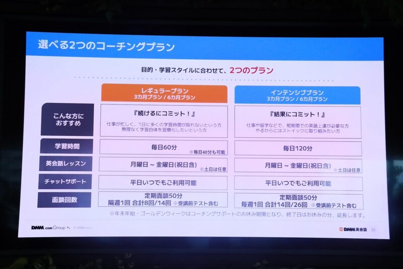 DMM英会話コーチングは、受講者の生活スタイルなどに合わせて「レギュラープラン」「インテンシブプラン」の2つのプランで提供。